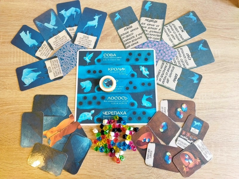 Затем стала вовлекать в игру красивыми компонентами и достала самодельных Духов природы. Немного карт, простые стандартные действия, вся информация по подсчету очков наглядно представлена на игровом планшете – сверкающие кристаллы. Единственной проблемой по началу были мелкие карты духов – переделала и игра пошла бодро. Мне и самой понравился вариант карт с крупным текстом. Успех игры был ошеломительный – родители играли по 10-15 партий подряд!