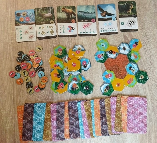 Выбирая игры для пенсионеров, избегаю текста на картах, поэтому предложила Поляну – не сразу, а когда мама полгода уже играла в разные игры. Но она оказалась сложной для обоих родителей. Несмотря на то, что тут только иконки, но планирование комбинаций, что взять, кого поселить и игра на двух полях Костер и Поляна (мы играли естественно без допа) вызвали огромные сложности.