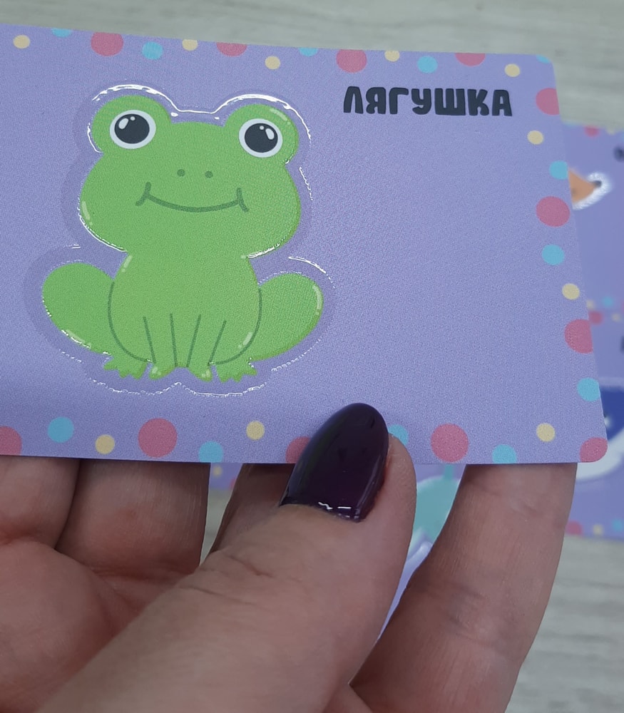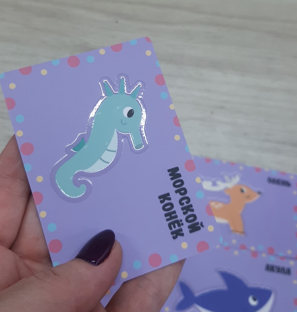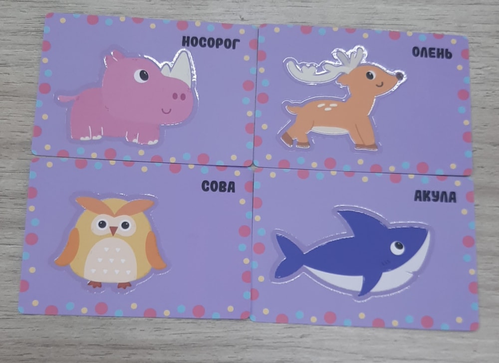 В игре 48 карточек, очень приятных и внешне, и на ощупь. С одной стороны карточки 4 рисунка животных, а с обратной стороны более крупный рисунок одного из этих четырёх с объёмным контуром.