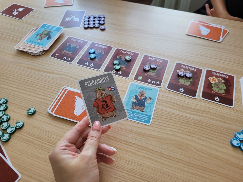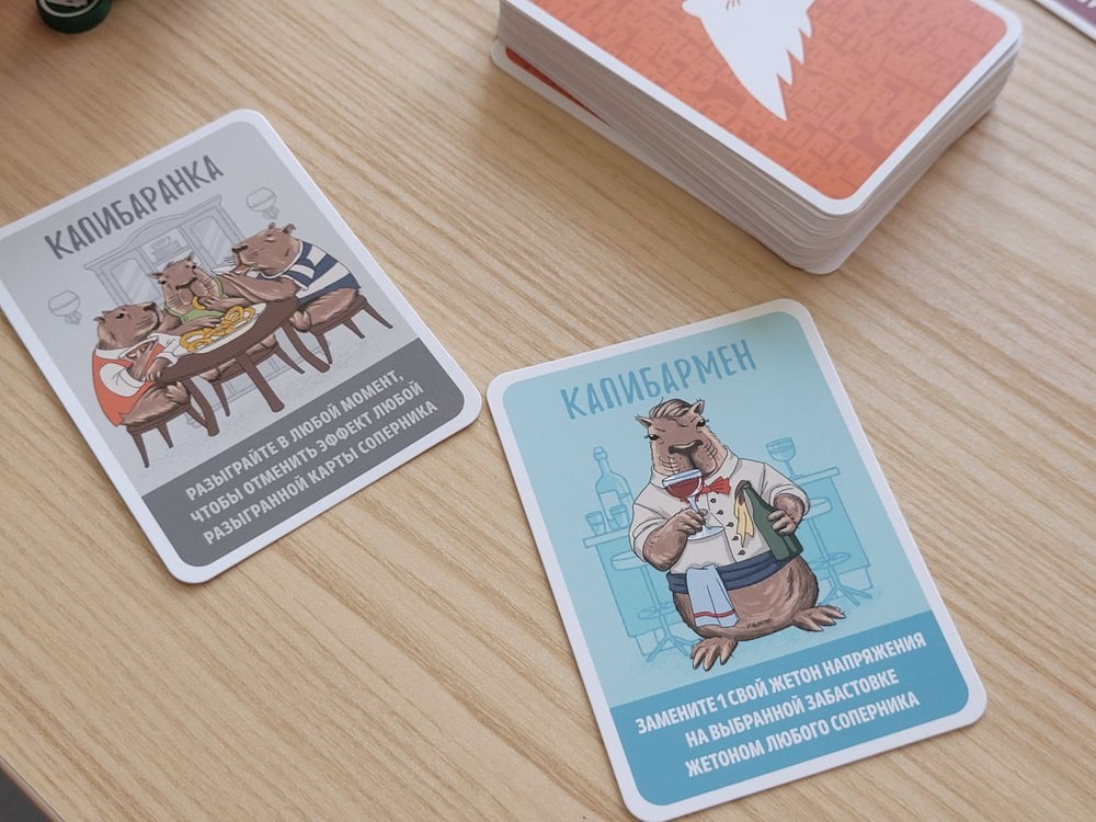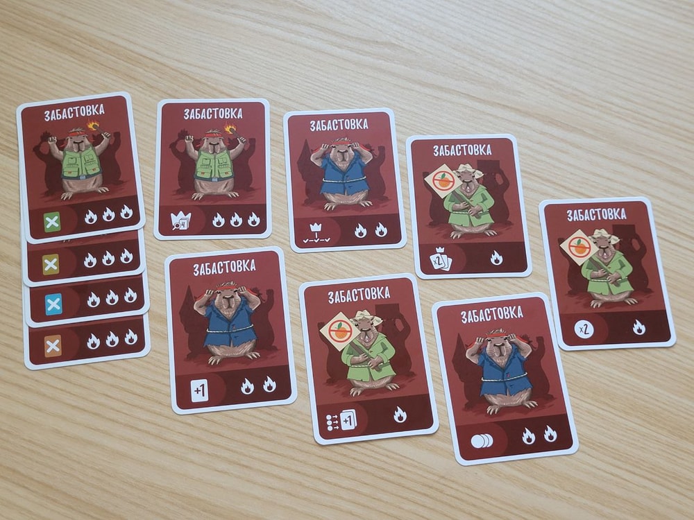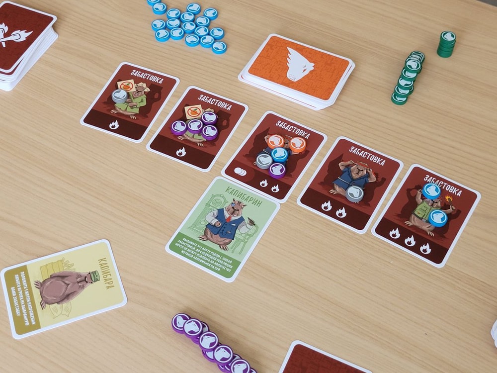 Конечно же действия нужно совершать так, чтобы был минимальный риск самому заполучить штрафы, то есть я стараюсь, чтобы моих жетонов на картах было меньше, чем жетонов соперников. Или, по крайней мере, мне достались карты забастовок с одним огоньком, а соперникам с двумя-тремя. В колоде есть 4 карты Капибаранки, они позволяют отменить действие только что выложенной карты.