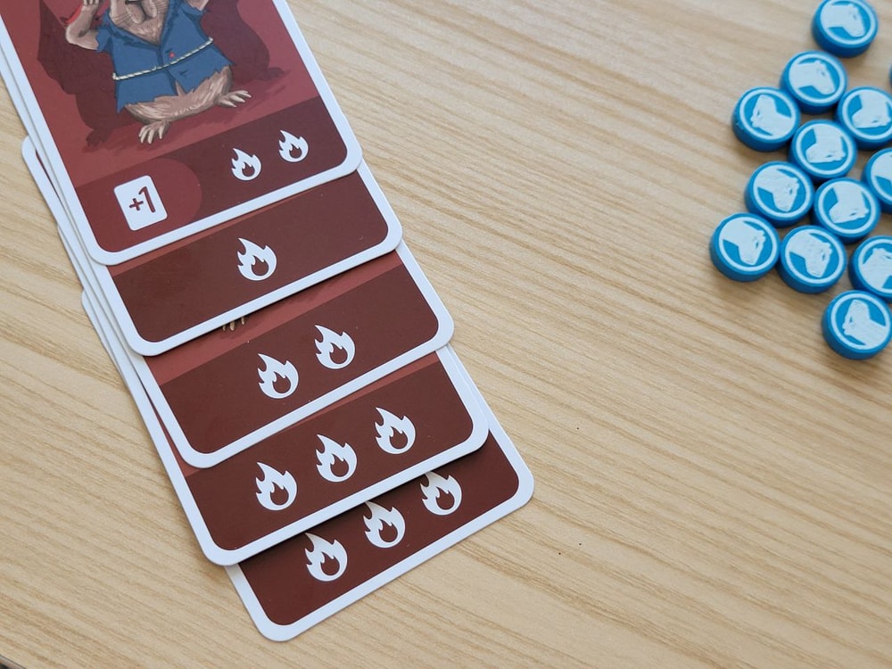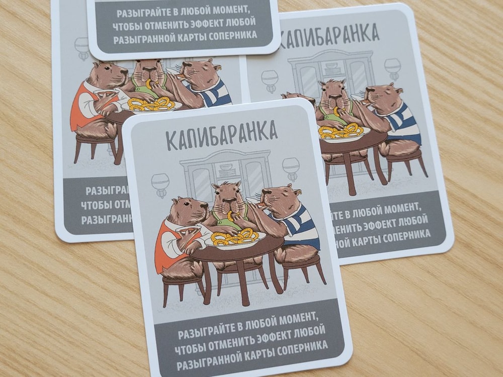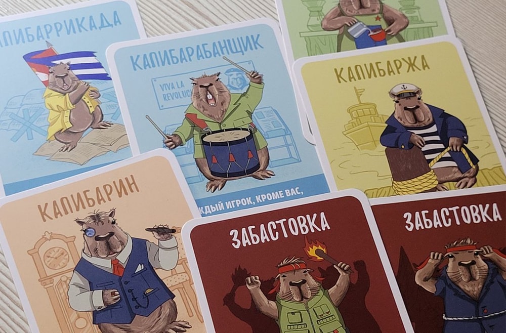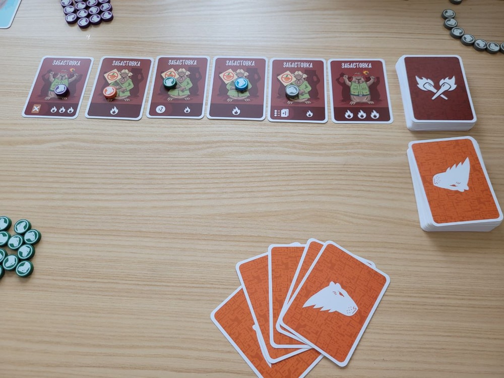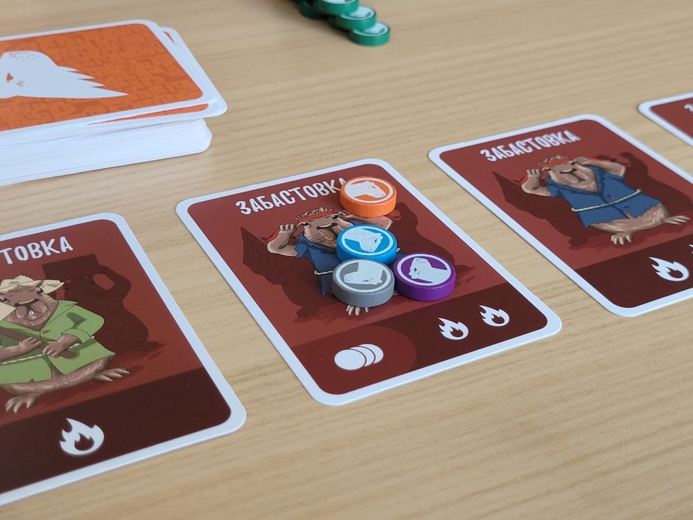 Конечно же действия нужно совершать так, чтобы был минимальный риск самому заполучить штрафы, то есть я стараюсь, чтобы моих жетонов на картах было меньше, чем жетонов соперников. Или, по крайней мере, мне достались карты забастовок с одним огоньком, а соперникам с двумя-тремя. В колоде есть 4 карты Капибаранки, они позволяют отменить действие только что выложенной карты.