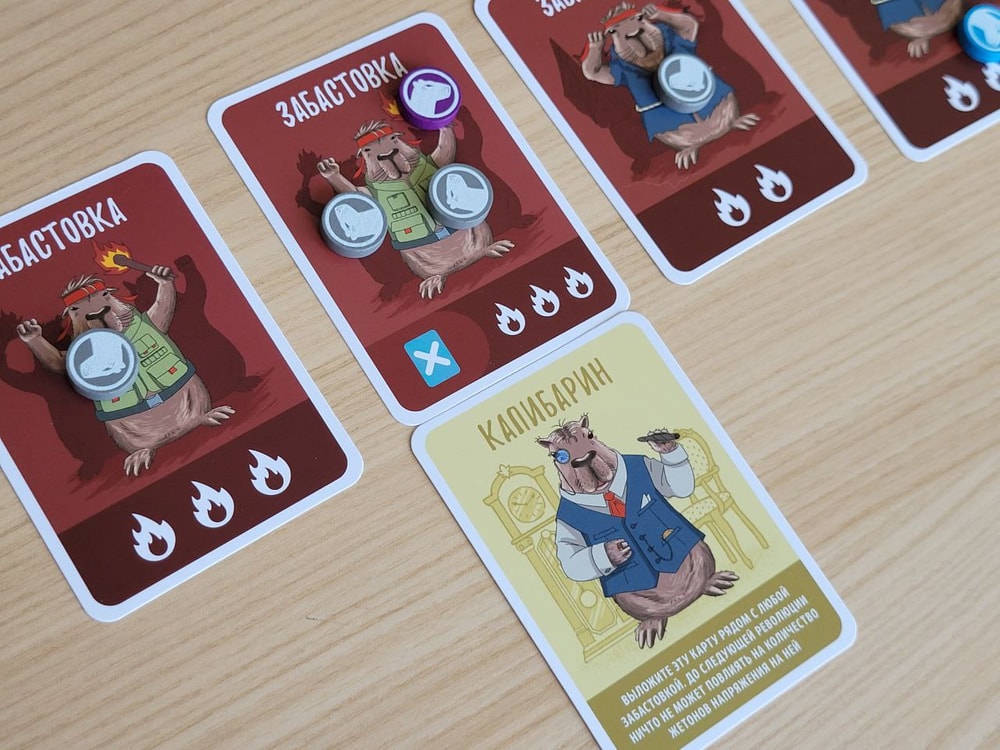 Есть прикольные фишечки, типа карты Капибарина, которая блокирует одну забастовку так, что с ней ничего уже нельзя сделать до революции (ни добавить, ни убрать жетоны). Или свойства нескольких карт забастовок, которые вносят еще больше хаоса - на некоторые нельзя влиять картами определенного цвета, какие-то предписывают добавить\удвоить жетоны напряжения и т.п.