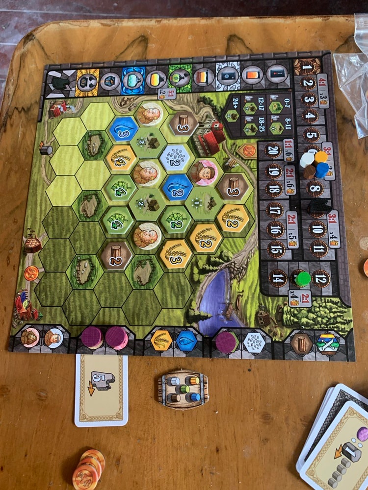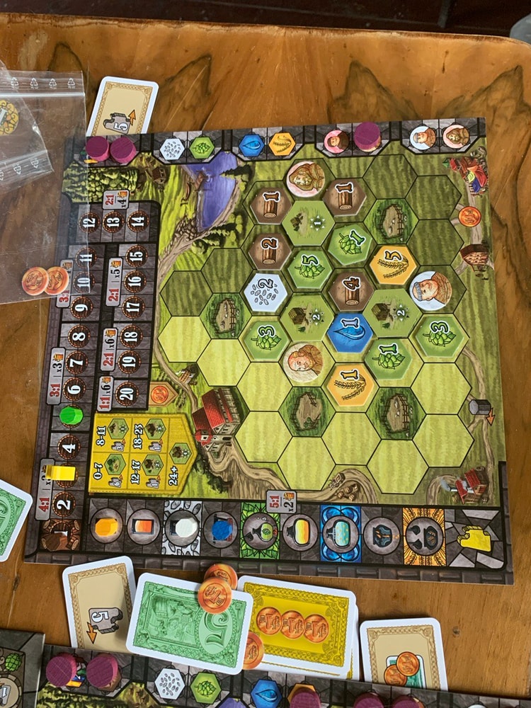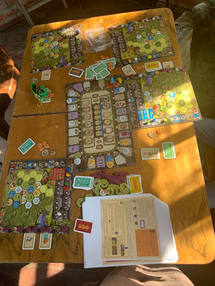 У самой игры не такие уж сложные и большие правила, при этом она очень изящная, на мой взгляд, и кризисная. Мы будем строить из тайлов участок на планшете, покупая тайлы на ронделе и потом активируя их для получения денег и улучшения ресурсов. Все, как обычно, связано со всем, нельзя уйти в какую-то одну стратегию, упустив остальные пути развития. Здесь очень интересный и необычный способ подсчета ПО, который зависит от прокачки ресурсов. В целом игра именно что мозголомная, не дающая расслабиться. Подойдет, как мне кажется, любителям таких игр как Замки Бургундии, но тут просчитывать и планировать даже больше надо. Я такое люблю, хотя часто не получается планировать удачно. Но сам подход, то есть вот такое евро-евро, мне очень нравится.