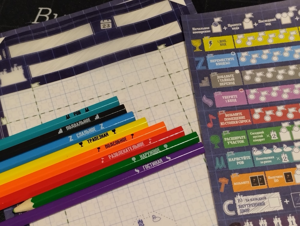 Полупрозрачные листы-калька, чтобы вы могли положить под него карточку с фигурой и обвести, а не перерисовывать (хотя для детей это может стать отличным навыком))), ластик в виде зАмка, цветные карандаши с названиями комнат, плотные карточки с яркой печатью.