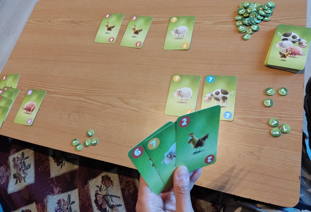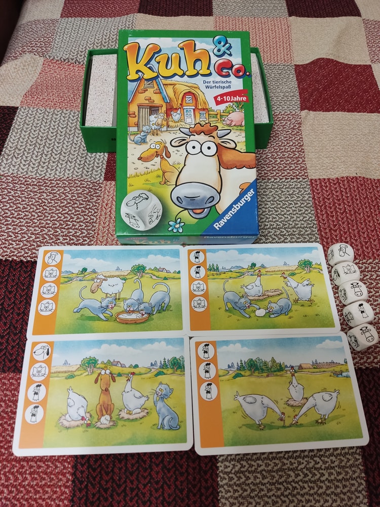 5. "Корова и компания". Эту игру я захотела сразу, как только прочитала о ней в сообществе, но зная нелюбовь сына к рандомным играм с кубиками, сдерживала свой покупательский порыв три года. Но этим летом я решила, что игра отлично впишется в частные занятия немецким с моим мальчиком, и наконец-то заказала её на авито. А сын увидел её в сумке и захотел сыграть. И ещё раз. И ещё. Мы отыграли с ним все карточки - очень забавные животные на них изображены. И кубики бросались с удовольствием. Но больше в неё сын не хочет. Игра будет ждать встречи с моим учеником.