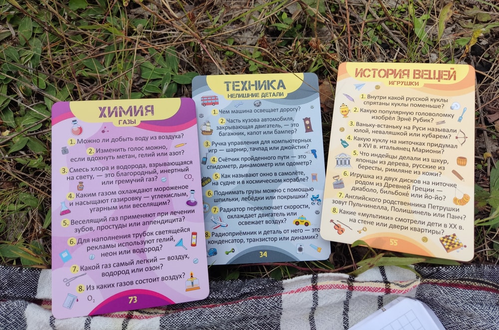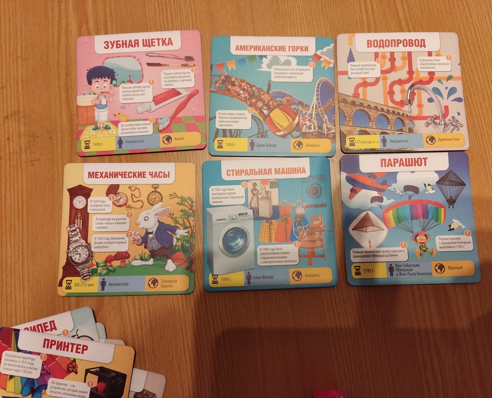 д) Коробочка знаний "Изобретения". Тоже увезла за город. Карточки на запоминание информации и картинок. Запоминаешь ты в каком году был изобретён пылесос, а вопрос выпадает " Сколько пылинок изображено на карточке? " грубо говоря.