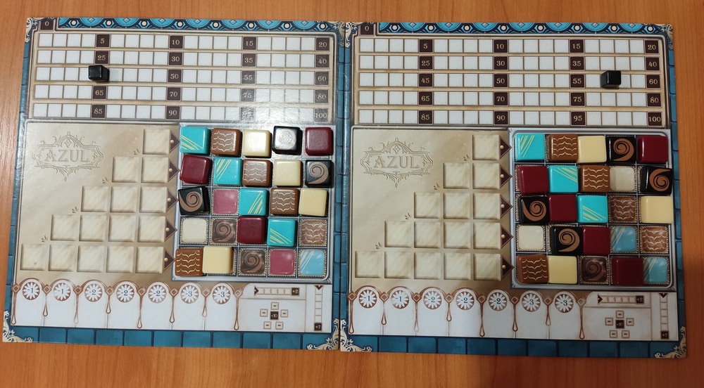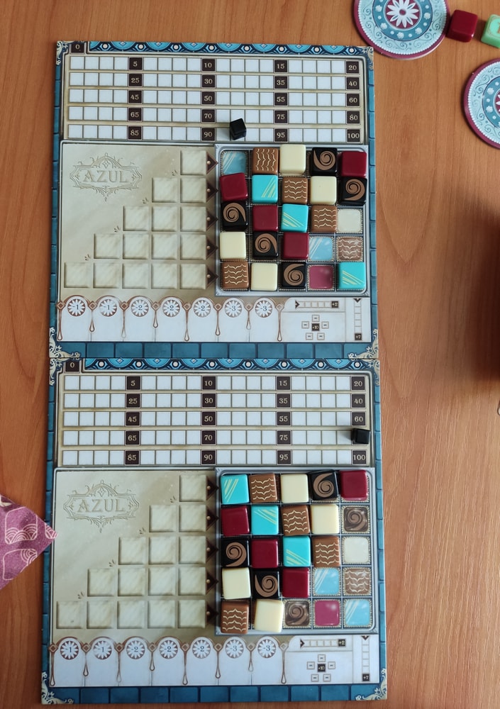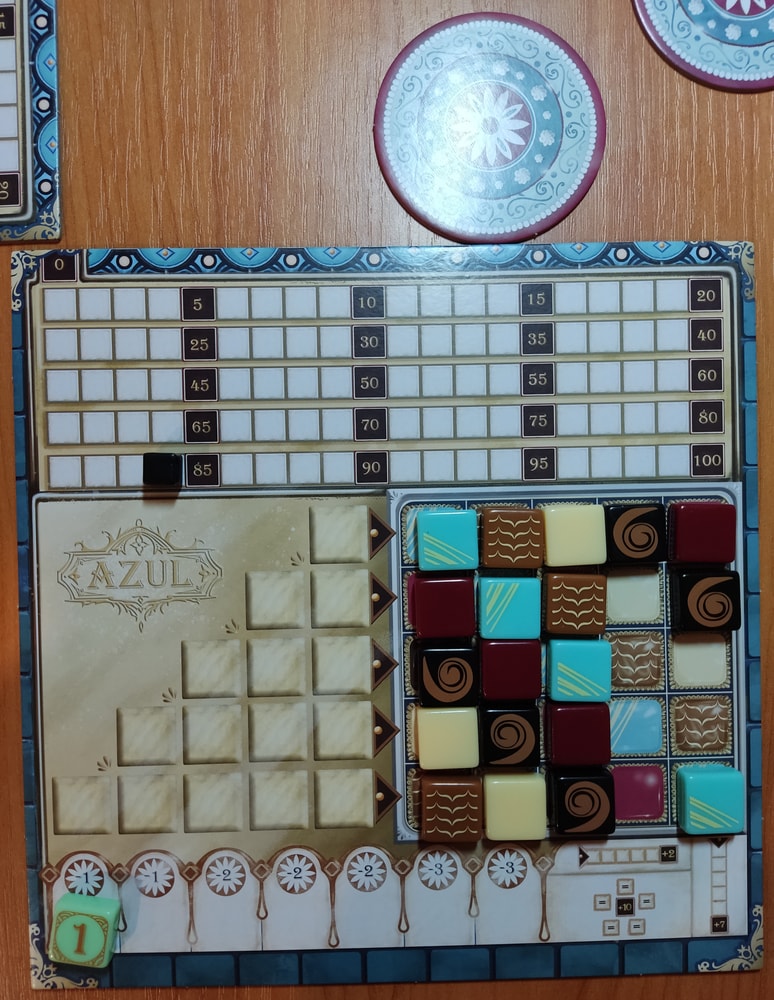 Вначале мы играли по правилам первого азула, которые я изучила у Кати. Катя меня даже очки считать научила! В этих партиях побеждал только сын