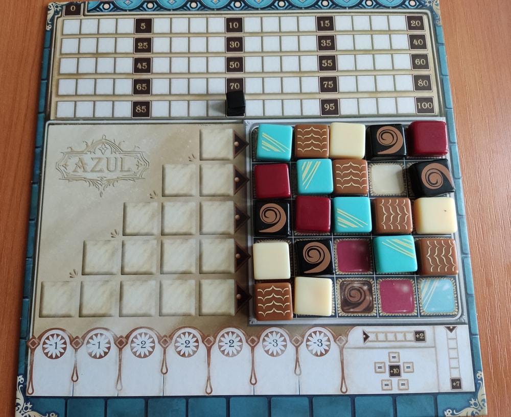 9. А здесь игра, которую я "подарила" себе на день рождения - Азул Шоколатье. Купила сразу, как она появилась в продаже, думала, что его сразу раскупят, а какой-никакой азул должен быть и у меня. И вот я его открыла и влюбилась в эти плиточки. Все те азулы, что я видела до этого, померкли в моих глазах. Белые плиточки, плиточки молочного шоколада, горький шоколад - какие они тактильно-приятные и ласкающие взгляд играющего. Какие замечательные коробочки конфет собираются к концу партии