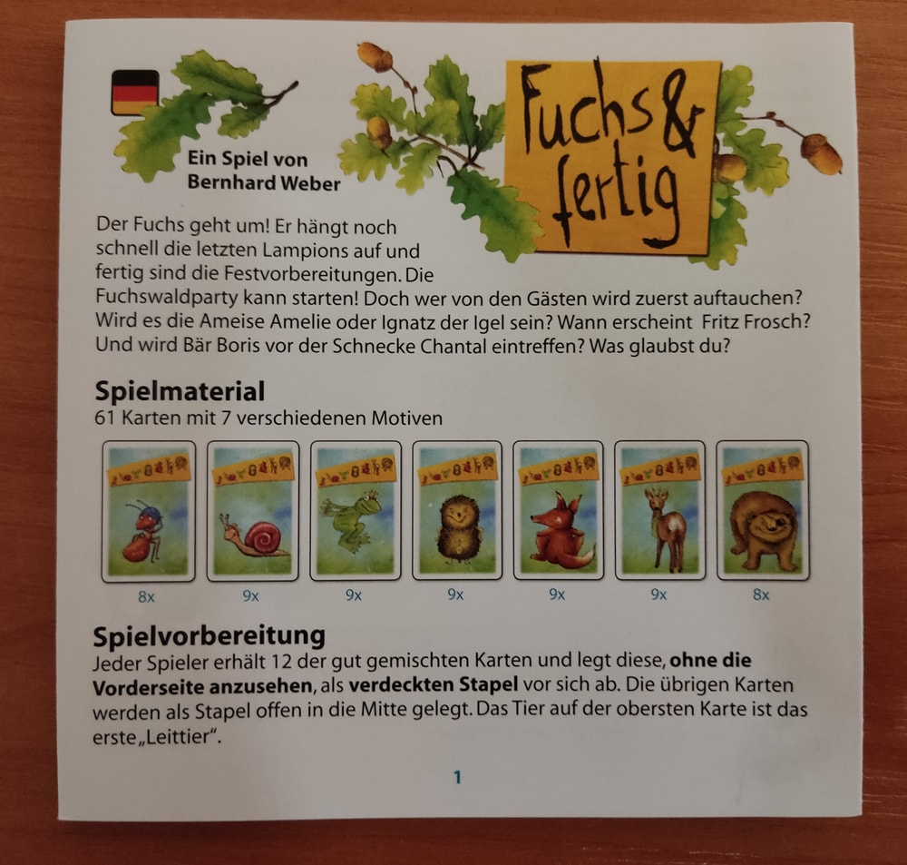 а) Ещё одна немецкая игрулька, нацеленная на мои занятия, но ненадолго появившаяся на нашем столе. "Fuchs und fertig". В немецком языке есть такое выражение "fix und fertig" и первое слово созвучно с названием игры за исключением гласной: фукс и фикс. Базовое выражение значит "быть абсолютно готовым". А игра, по_видимому, переводится " Лисичка и готово". Очень простая игра на сравнение параметров. В колоде семь видов животных разного размера