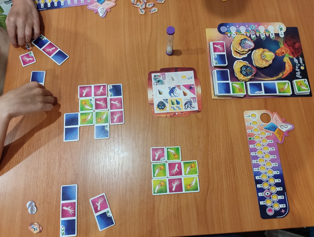 А потом мы начали использовать изюминку тарелочек - в каждом новом раунде нужно поворачивать рандомно две тарелочки и там какой-то бонус: то +1 плиточка, то плиточки не сбрасываются в середину стола, то минус один штраф... И тут пошли мои победы 😊