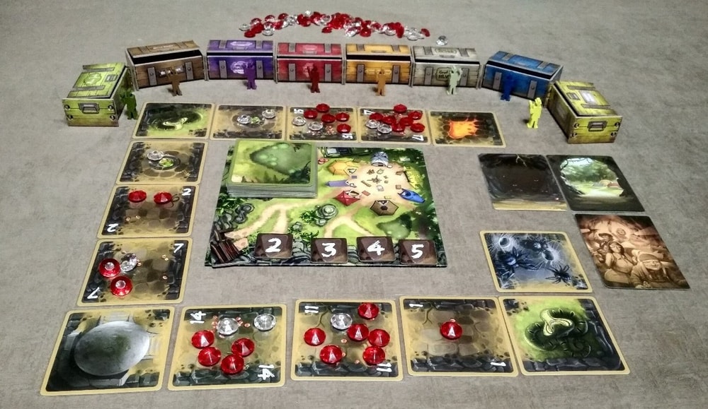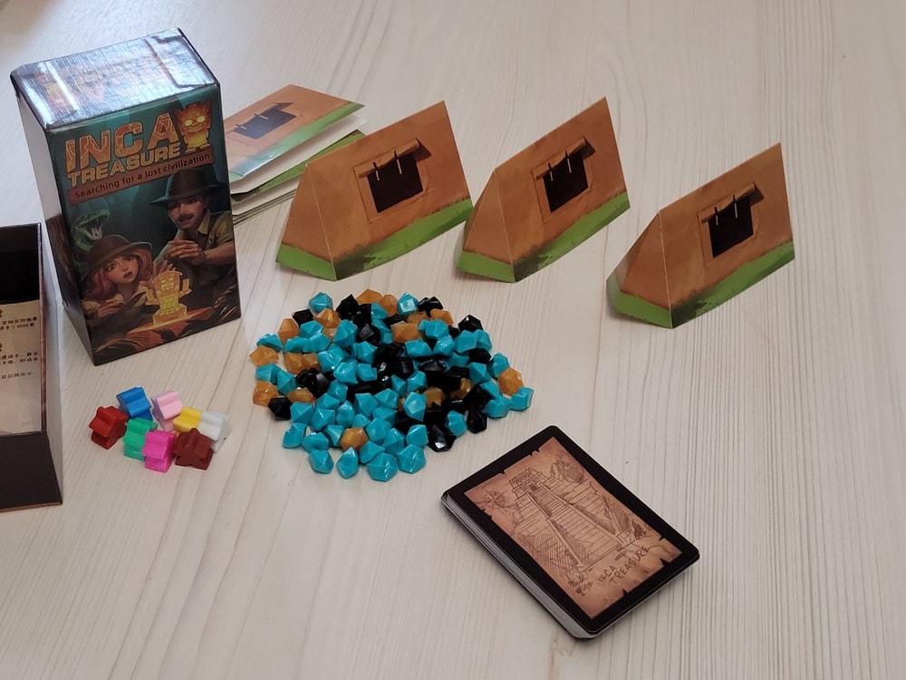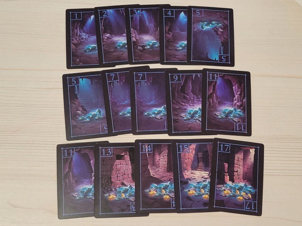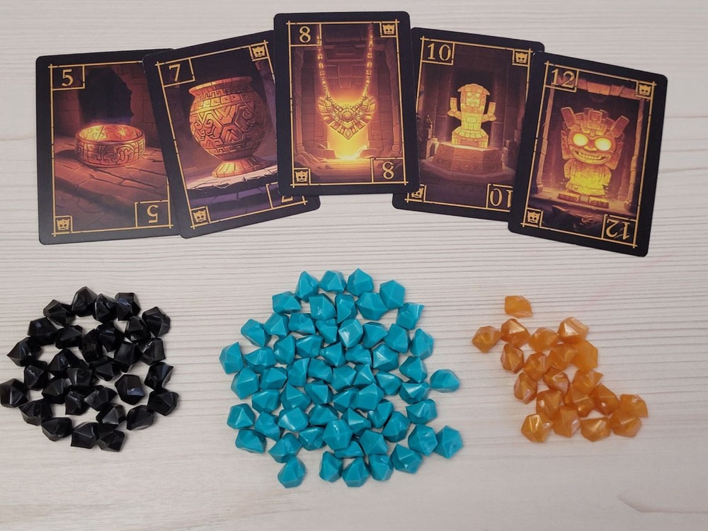 В каждом скрыты какие-то сокровища и артефакты. Их нужно из пещеры вынести, но это может быть не так уж просто. Сокровищ в коробке 3 вида, но это по сути просто победные очки - бирюза 1 очко, обсидиан 5 очков, золото 10 очков. В любой момент игры можно разменивать их как угодно. Карточки артефактов замешиваются в колоду по одной за раунд от меньших очков к большим.