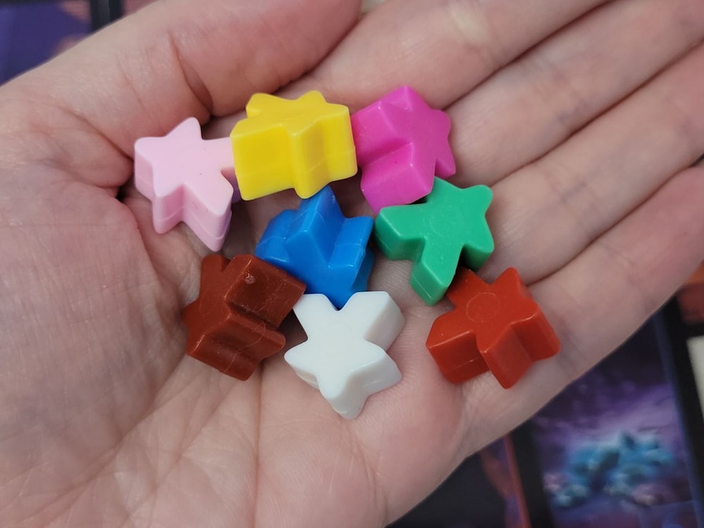 8 миплов, 8 палаток, 3 вида сокровищ, колода карт. Миплы обычного размера, но пластиковые, качество неплохое. Некоторые цвета, конечно, спорные, но в игре это значения не имеет, путаться не будут.