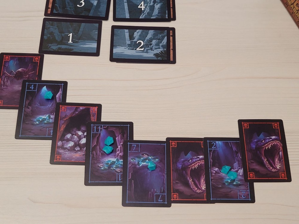 Ведь как только выйдет повторная карта опасности (на фото выше вышла вторая змея), игроки, которые до этого не ушли из пещеры, теряют все.