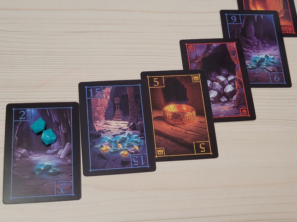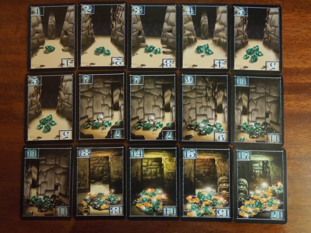 Когда вышла первая ловушка каждого вида, можно идти дальше. Но как только вышла такая же вторая, то искатели сокровищ в страхе бегут к выходу, бросая все, что уже собрали к этому моменту, то есть оканчивают раунд ни с чем. Поэтому и игра на жадность - ограничишься ли ты малым или будешь рисковать, надеясь избежать опасностей и набить полные карманы?.. Выход карт абсолютно рандомный. Ловушки могут идти подряд, а могут дать возможность набрать много сокровищ, это непредсказуемо. Карты сокровищ со значениями от 1 до 17, всего их 15, то есть столько же, сколько и карт ловушек.
