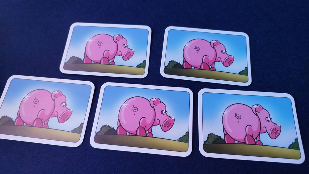 При игре вдвоем раздаем по 5 карт стороной с несчастными чистыми свинками и по 3 (можно 4) карты из колоды на руку: