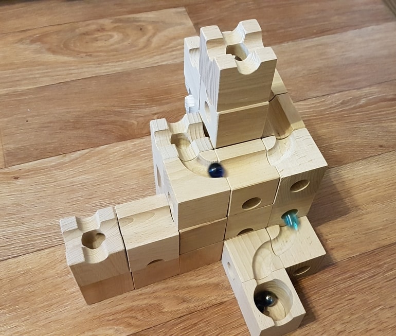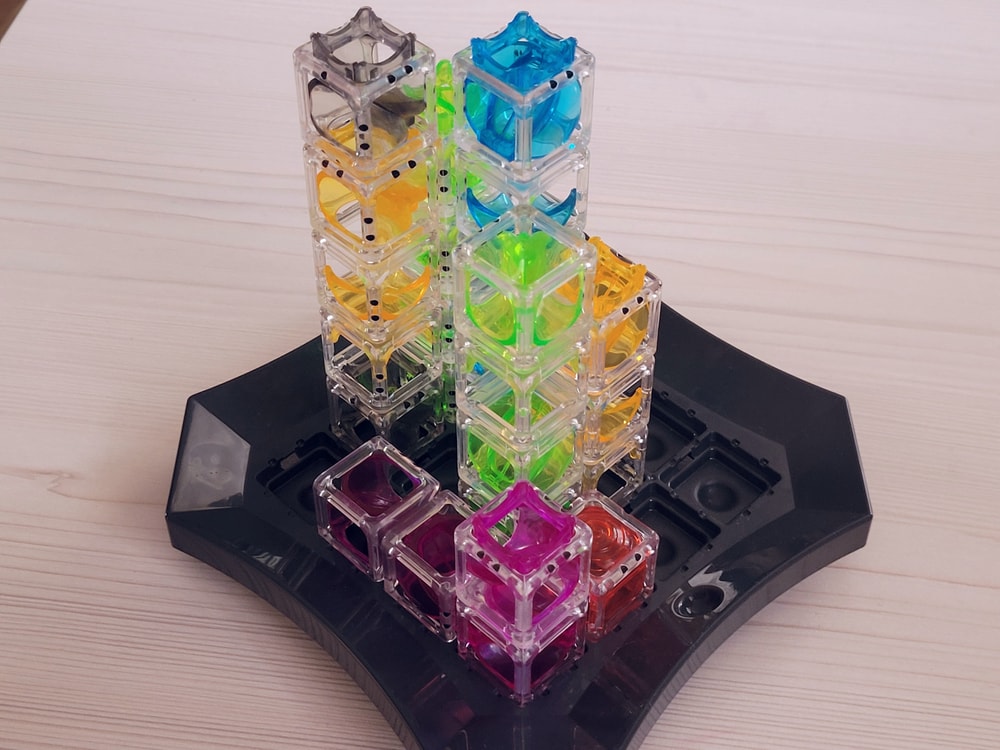 Что собой представляет головоломка? Необходимо построить путь из башенок, чтобы металлический шарик, запущенный в начальную башню, достиг конечной. Мои дети (да и я) любят подобного рода развлечения, я как-то показывала конструктор по тому же принципу - строим из блоков путь для шариков - он пользовался у детей большой популярностью.
