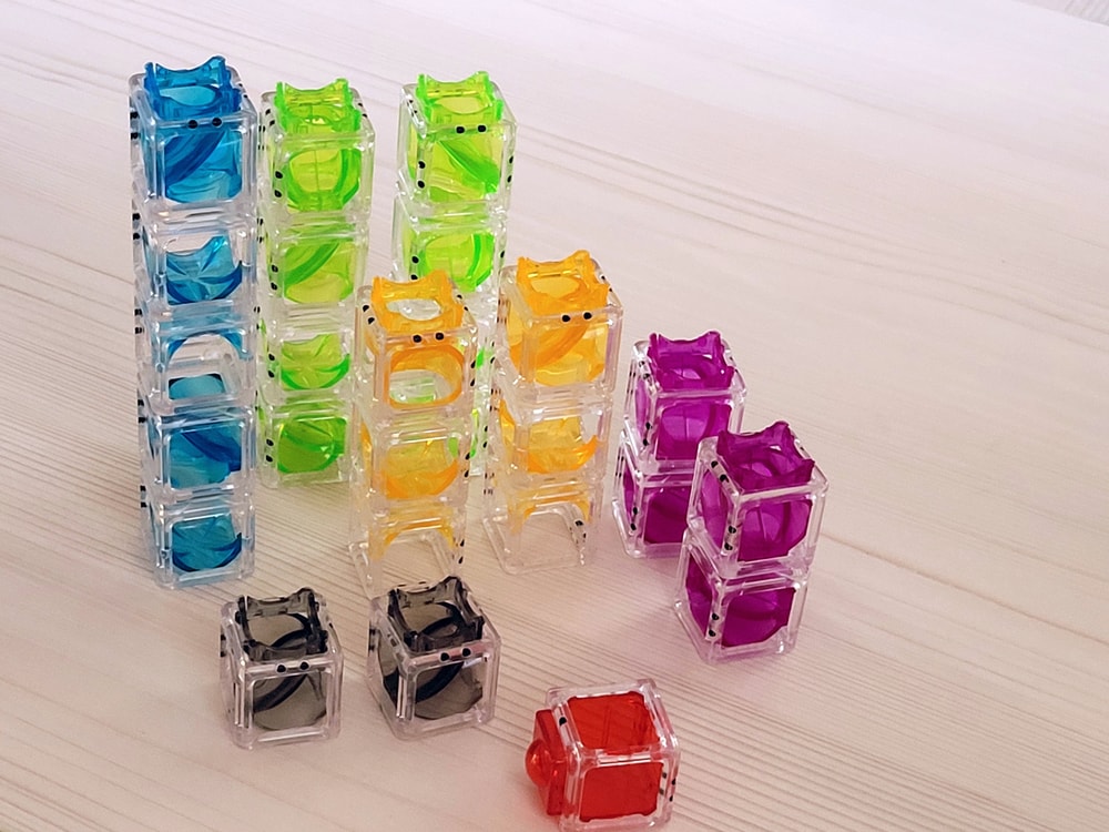 Я решила уже зеленый (начальный) и оранжевый (средний) уровни. Не скажу, что второй дался мне так уж легко, подумать есть над чем, не все задания решила с первого раза. Проходила я его не один вечер (можно и за один, конечно, но я уставала и делала перерыв). В расстановке башен есть логика - необходимо рассматривать каждый этаж, чтобы понимать, как шарик может прокатиться через него. Башню приходится повертеть, прежде чем установить, чтобы задать шарику нужное направление. Задача усложняется тем, что башни можно устанавливать друг на друга, у них для этого есть специальные крепления с одной стороны.