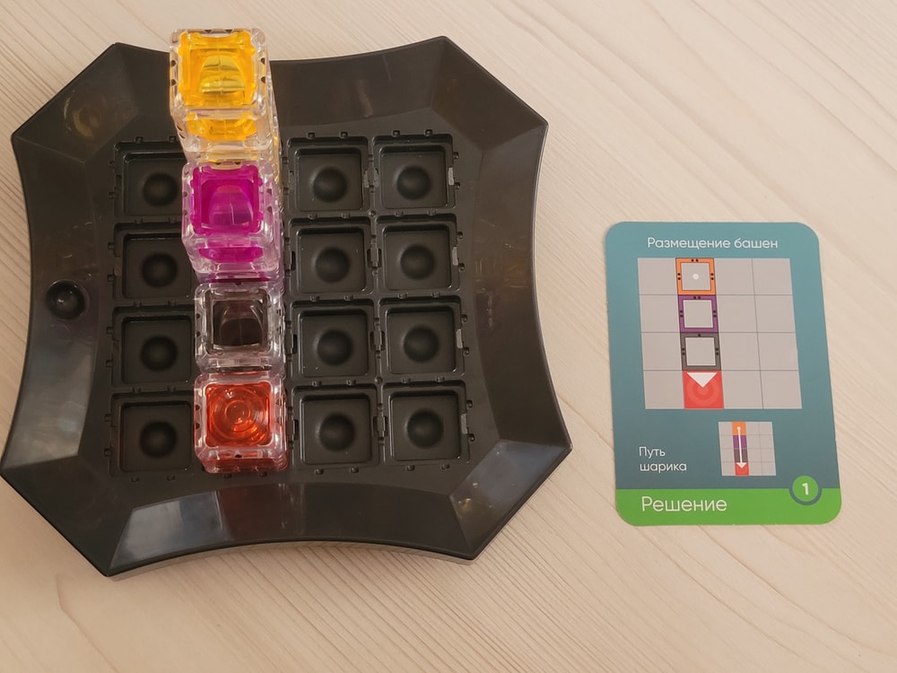 Как бы мы ни располагали башни - обязательное условие остается неизменным - шарик должен добежать от начальной точки в красную башенку. В правилах не указано, единственный ли верный ответ может быть. В 20-м задании мое решение не совпало с тем, что указано на обороте карты, но шарик прошел нужный путь до красной башни, поэтому я считаю свое решение верным.