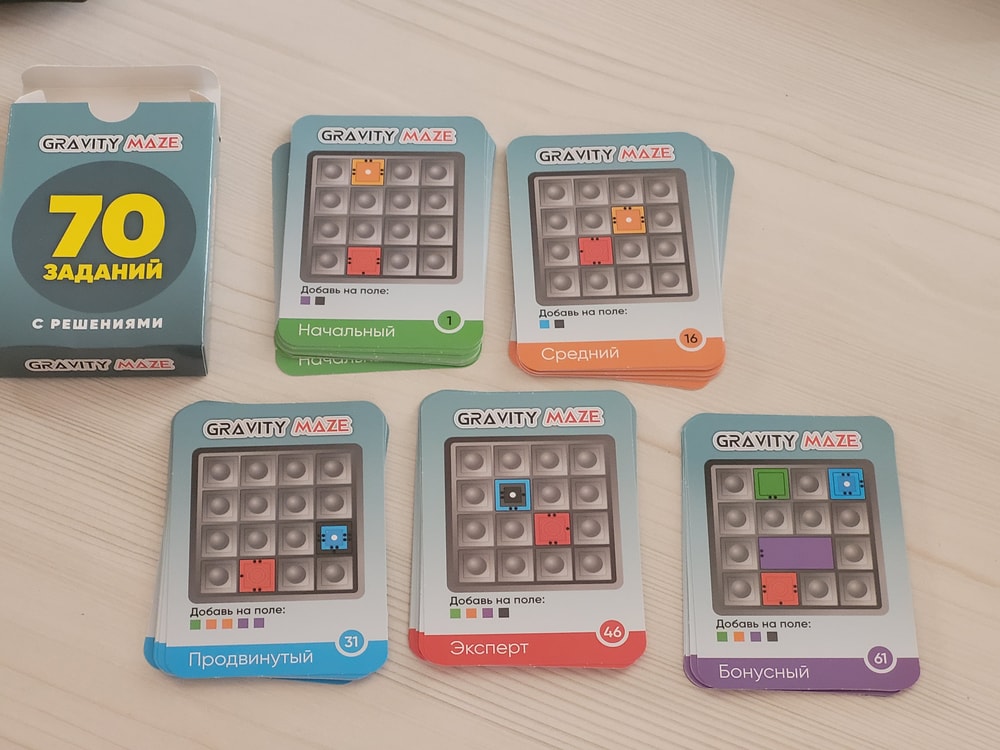 Всего уровней сложности 5, они разделены по цветам, как часто бывает в головоломках. Заданий 70 штук (в оригинальной игре, судя по надписи на коробке, 60 заданий). Те задания, что я могла сравнить, с оригиналом совпадают, но за все не поручусь.