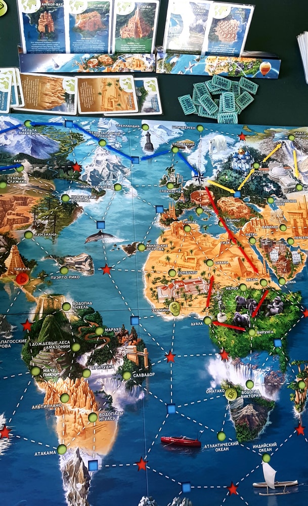 Семейная стратегия для детей от 8 лет и взрослых. Вы - путешественники, у которых цель- посетить определенные Достопримечательности в разных точках земного шара. Смотря на поле - карту- сразу вспоминается , конечно же, игра Билет на поезд.