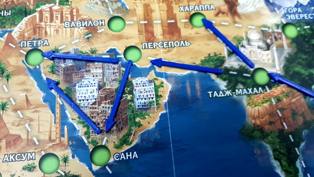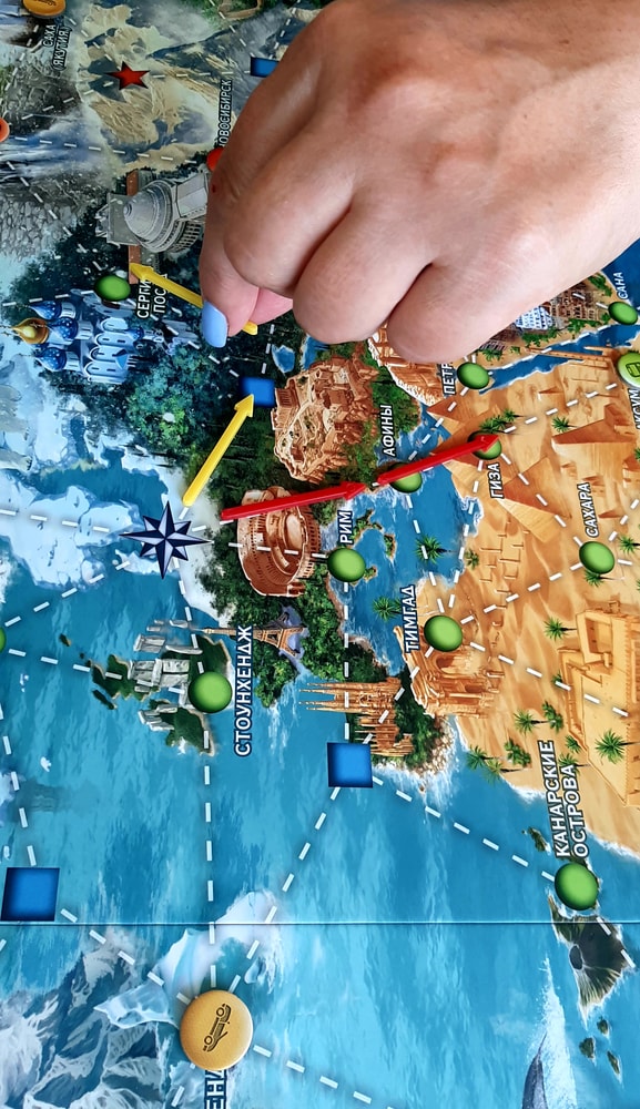 Всего маршрута 3, начинаются они от одной точки, отличаются цветом стрелочек, и в своей ход вы можете продолжить маршрут любого цвета.Пытаетесь, значит, Вы в свой ход попасть в пункт А, ставите стрелочку, и думаете Вот я в следующий ход то и буду на месте, а тут вашему сопернику надо в пункт Б,и он от вашего пункта А маршрут в другую сторону и повернул.И вот до вас ход доходит, и начинаете Вы опять думать, куда и как быстро сможете попасть) Так как экспедиций три, это не выглядит как топтание на месте.