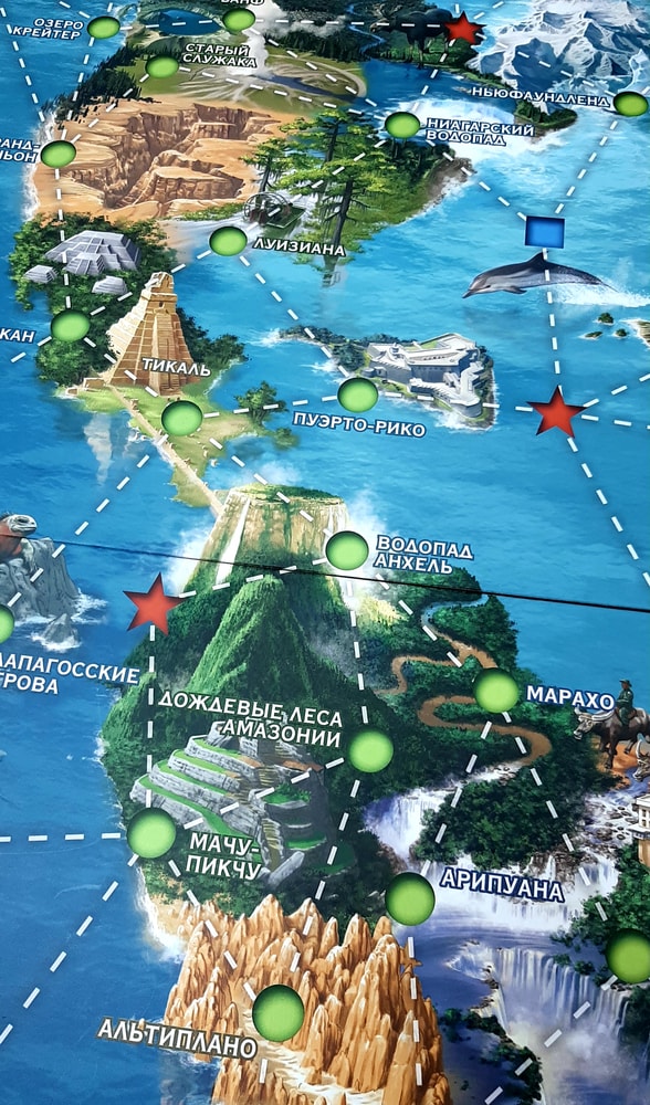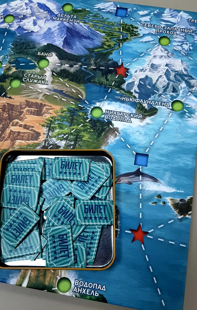 На поле помимо зеленых точек - достопримечательностей- есть синие квадратики, которые дают вам возможность сразу сделать еще один ход, и красные звёздочки, которые приносят Вам билет.