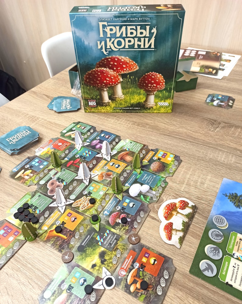 Второе яркое впечатление - партия в новинку Грибы и корни у магазине у Хобби геймс. Мне было очень интересно составить впечатление о новой игре от автора Крыльев Элизабет Харгрейв, тем более что природная тематика у нас - одна из любимых. Игра оказалась достойной внимания, огромный плюс - интересная взаимосвязь между неизбитой темой игры и реальными процессами симбиоза грибов и деревьев, что отражено в правилах.