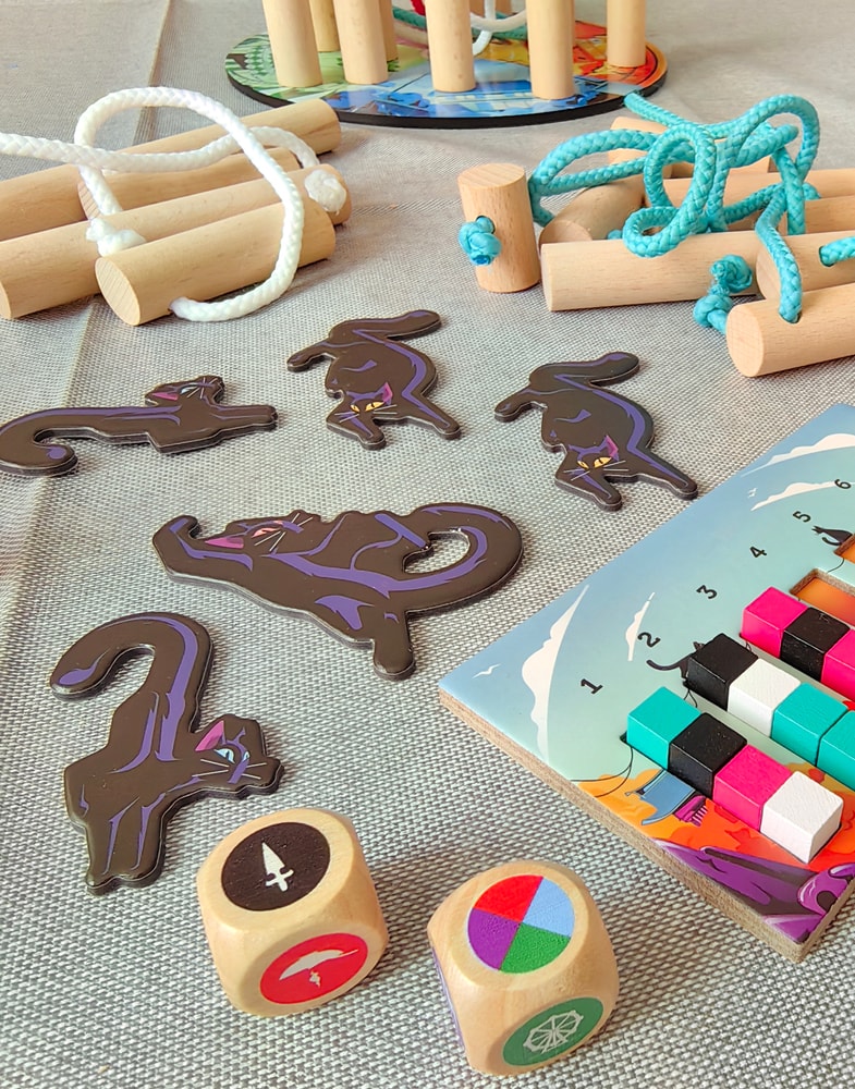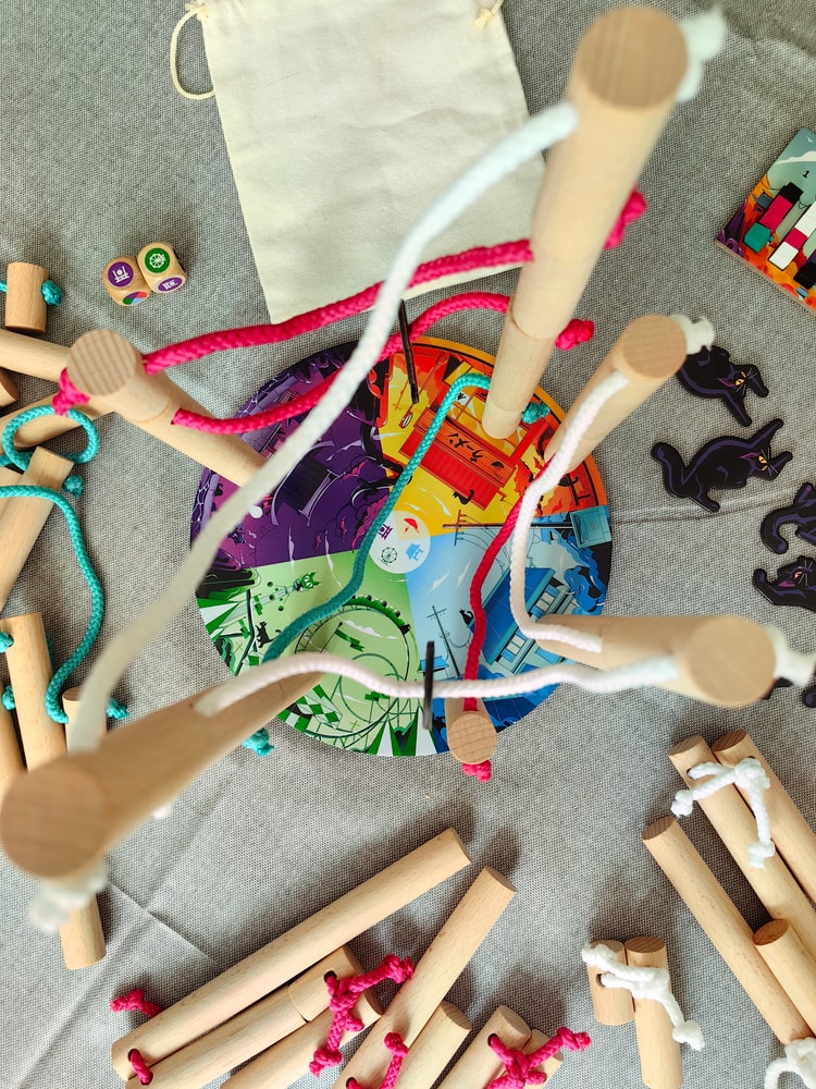 Районы для установки столбов мы выбираем не сами, а броском кубиков и, иногда, нам их выбирает соперник. Также и цвет веревочки определяется случайно - вы тянете цветной кубик из мешочка. И если вам попался черный, то ваши соперники будут в свой следующий ход цеплять котика на "провода"😜! Такие вроде бы простые действия - бросок кубиков, и рандомный выбор цвета проводов, делают обычную игру на ловкость азартнее и интересной не только детям, но и взрослым.