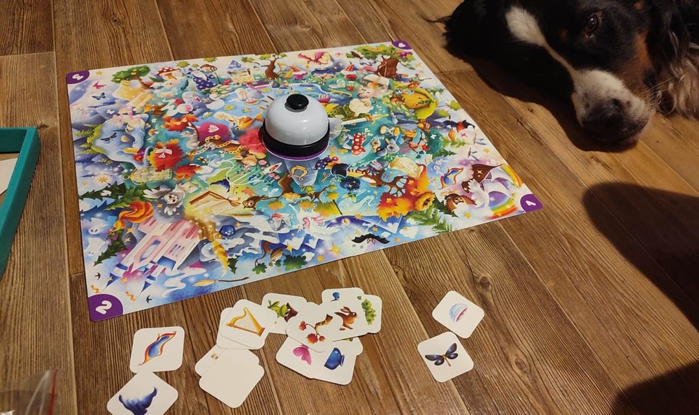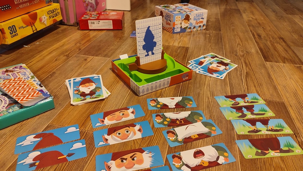 11. Здесь был гном - настольная игра на внимательность, скорость и реакцию для 2–4 игроков в возрасте от 6 лет. Игроки соревнуются в том, кто быстрее соберёт гнома из четырёх карточек по памяти. Играем в кооперативном режиме с дочкой, собираем гнома вдвоем.