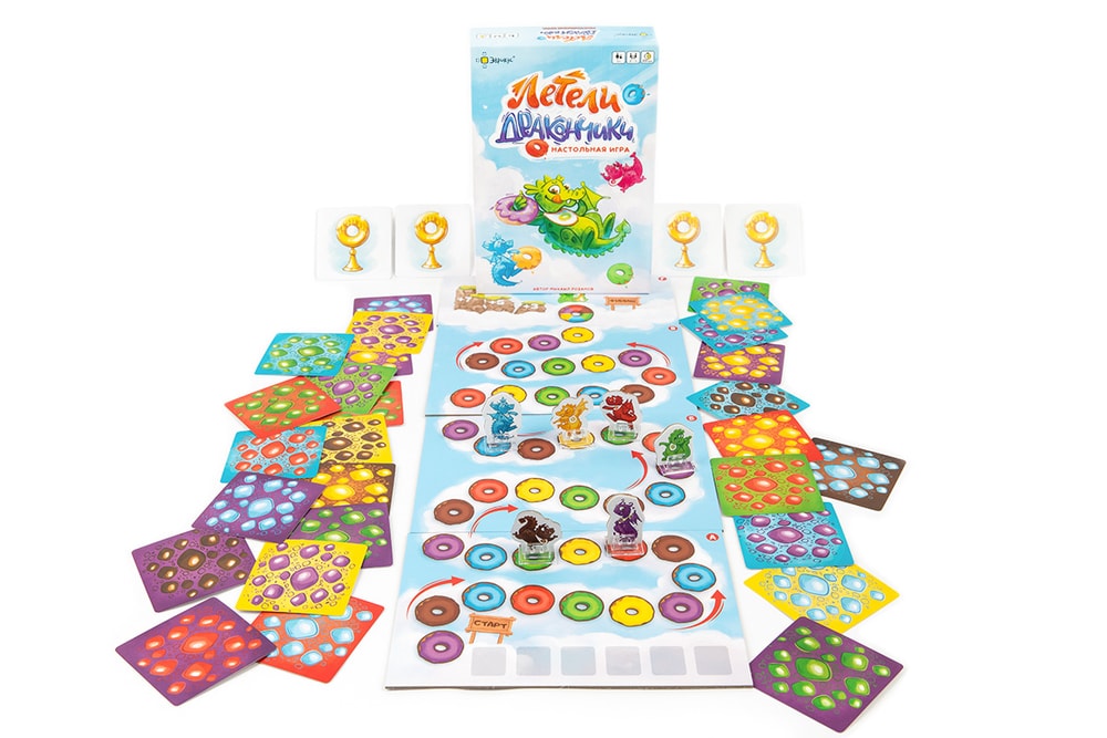 5. Летели дракончики – игра-гонка, в которой надо управлять дракончиками, что бы достичь своей цели, пытаясь привести своих подопечных к финишу. Игроки влияют на скорость полёта дракончиков, используя карты с пончиками — любимым лакомством сказочных существ. Очень интересная игра с удовольствием играем всей семьей. У игры есть усложнённый режим, где дракончики могут лететь не только веред, но и назад, с дочкой пока его не используем.