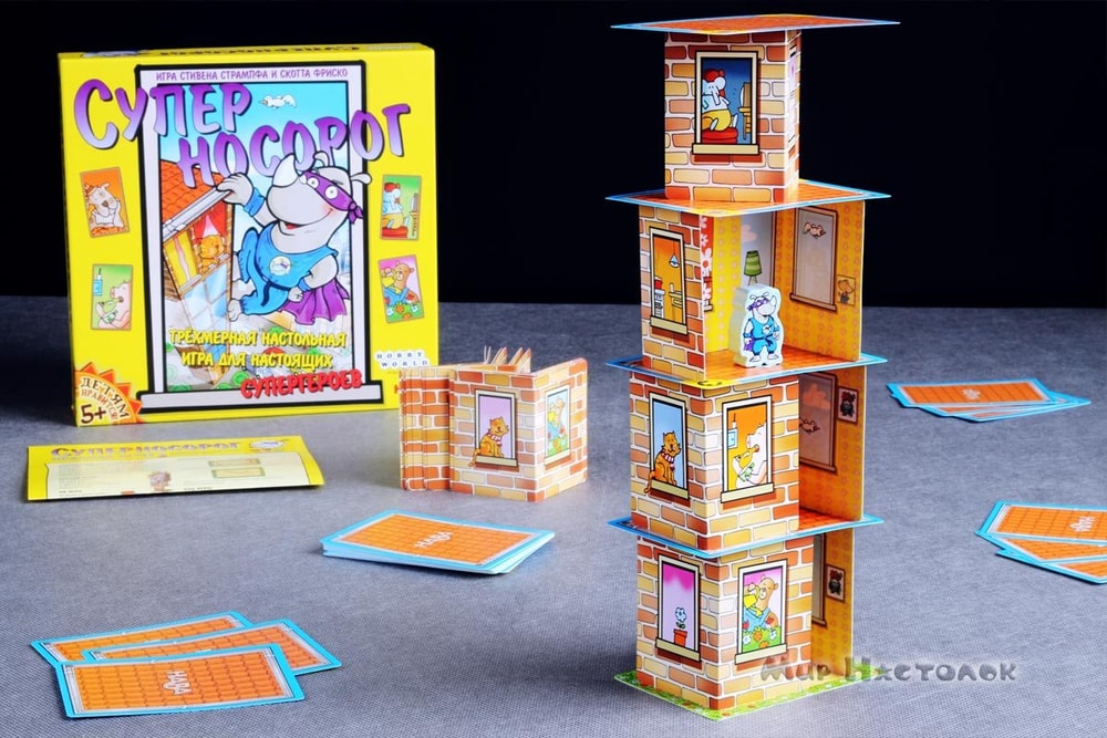 8. Супер носорог – это детская и семейная игра на ловкость, где игроки строят из карт небоскрёб для отважного супергероя Носорога. Игра у нас давно, есть еще аналог «Башня принцессы» раньше играли только в нее, сейчас больше в почете Суперносорог.