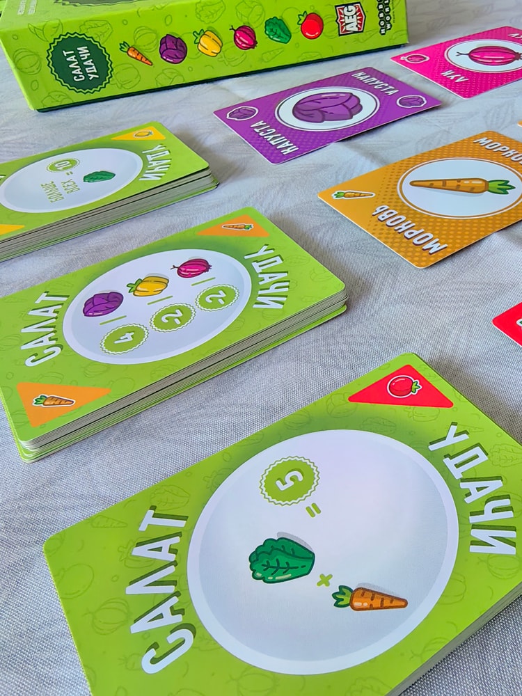 Салат удачи как семечки - закончил партию, и сразу хочется еще😁. Очень простой любимый сбор сетов, одна колода, которая по сути 2 и их не надо рассортировывать в конце игры - только перемешать и тут же можно продолжать👍. Хочу подобрать небольшой органайзер для маленьких и увлекательных игр в путешествия, туда точно войдет Салат удачи, Гача и следущая игра.