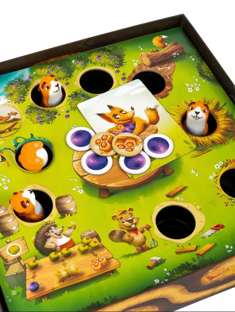 Нельзя ставить собачку в ту же норку , из который ее взяли . Каждая норка - это ячейка действия. Например с кустов мы собираем ягоды , берем из мешка жетон ягоды и смотрим какая нам попалась , спелая или тухленькая .Там есть милейший ежик , с которым можно поменяться плохими ягодами на хорошие ресурсы . Бобер , который дает много классных способностей . Любопытная лисичка , приходя к которой , мы тянем жетон из ее мешочка , там может быть , как хорошие ресурсы , так и опасные и тд. Всего 9 норок. Все ресурсы мы копим на столе в центре поля . И , приходя в норку , ведущую в кладовую , мы все ресурсы одного типа опускаем , как в копилку , в отверстие в поле ( для детей это главный момент игры ).