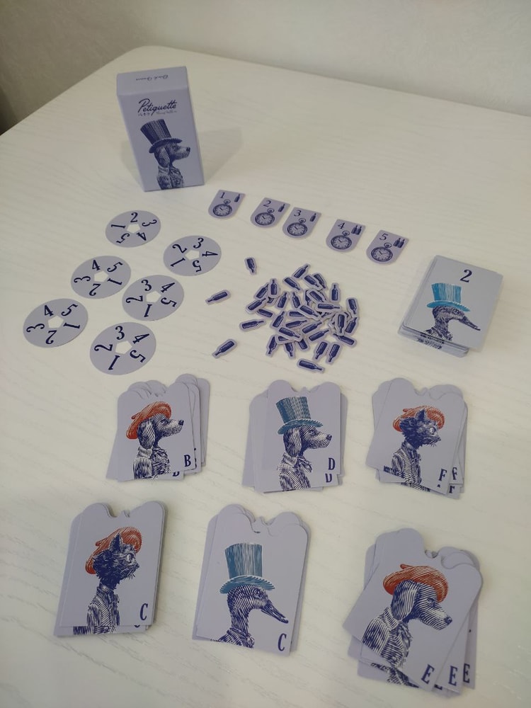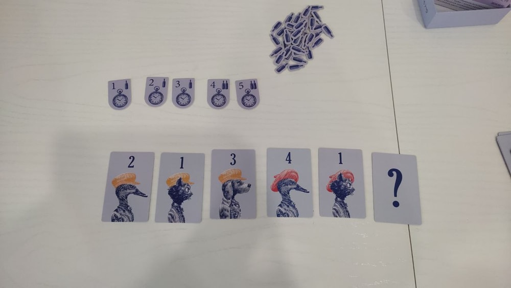 Итак, стопка карт, бутылочки для подсчета очков, 5 раундов, диски и карточки с животными для 6 игроков.