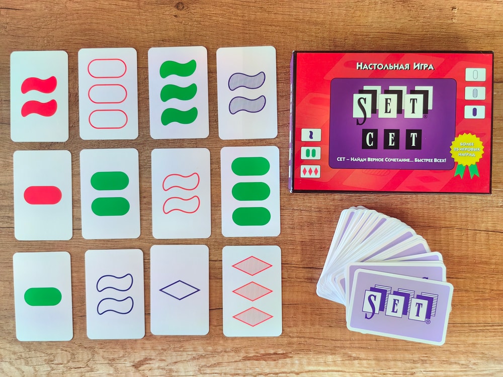 Сет купила лет 12 назад, в свою первую закупку игр. У меня тогда было 4 игры😂. Я воспринимаю его как головоломку, мне и одной интересно искать нужные комбинации. На приведенном примере нашла три сета, а вы?))