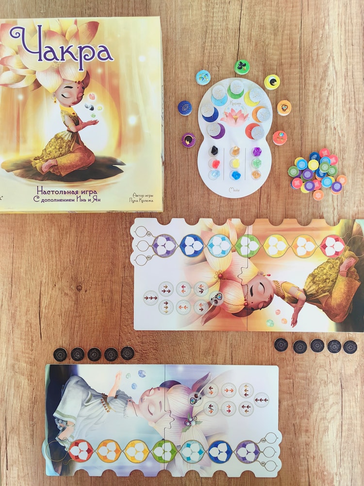 Чакра одна из самых заигранных игр, сменила на этом посту Пэчворк. Очень долго не брала еë из-за тематики, а потом прочитала подробный обзор и влюбилась в механику. Абсолютно не зашел первый доп с белыми камнями, а вот второй - бонусные действия за собранную ячейку - используем постоянно👍.