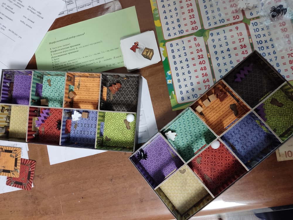 "Паника в поместье". Как мальчику понравились малюсенькие компоненты игры и эта первая фраза после объяснения правил: " Это же невозможно! " А оказалось возможно 😊 То и дело слышались знакомые: "Ну куда же ты ползёшь? Уходи! Ты здесь не нужен! Как его отсюда убрать? " Надо было эти фразы заготовить на немецком языке 🤣🤣🤣 А у меня была только фраза "Ich lege in dein Haus... - я кладу в твой дом... " А дальше, как, наверное, уже все поняли, тот, кого кладут в винительном падеже 😄