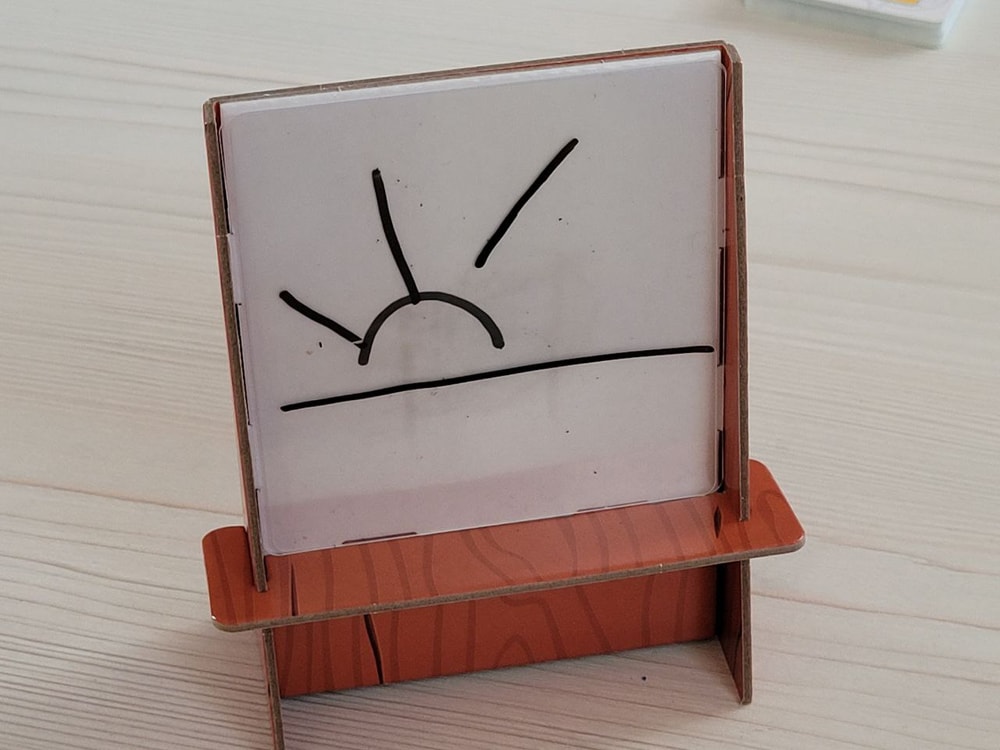 Две прямых и одна кривая – слоган игры. И в этом, в общем-то, вся ее суть: игрок в свой ход может нарисовать на карточке две прямых линии или одну кривую, таким образом он должен подсказать угадывающему, какое слово загадано. Изобразить понятную подсказку не так и просто, лишь однажды в нашей компании игрок угадал слово всего лишь с одной подсказки. Вот с такой: