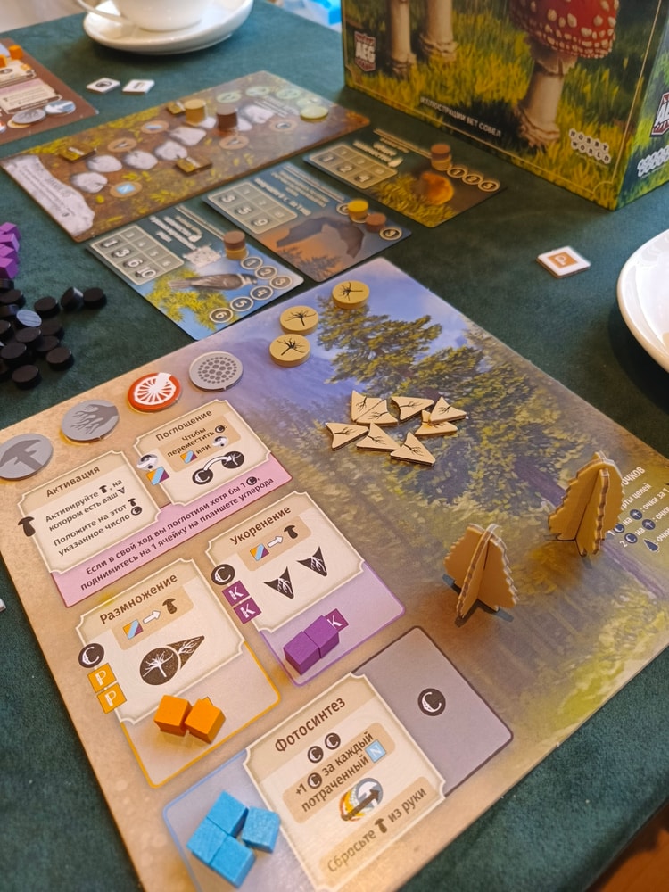 Напишу свое резюме. Игра красивая и атмосферная, любителям природы должна понравится. В освоении не сильно сложная, в ней будет и не большая гонка по треку углерода и контроль территорий при выращивании Ваших саженцев, но сильно вы друг другу мешать не будите, т.к. вокруг тайла гриба есть 4 места для размещения ростков и у каждого игрока есть возможность разместить росток и использовать св-во нужного Вам гриба.