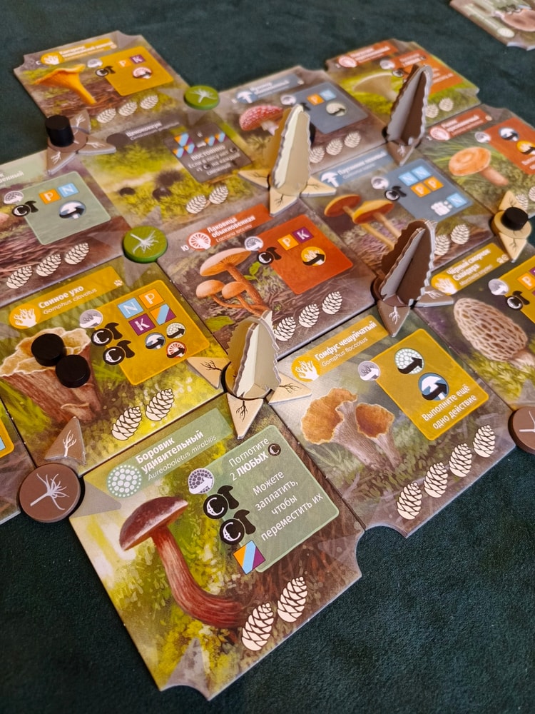 У каждого игрока будет свой планшет с действиями, за активацию которых мы будем платить разную стоимость азота, калия, фосфора и углерода. Это нужно, чтобы сажать новые побеги, пускать корни к грибам, активировать их свойства и выкладывать новые тайлы грибов. Основной задачей будет вырастить, как можно больше ростков пихты, превращая их во взрослые деревья и максимально подняться по треку углерода собирая бонусы. Плюс будут еще карты целей за которые вы получите доп очки.
