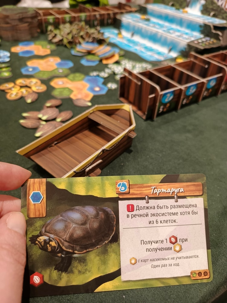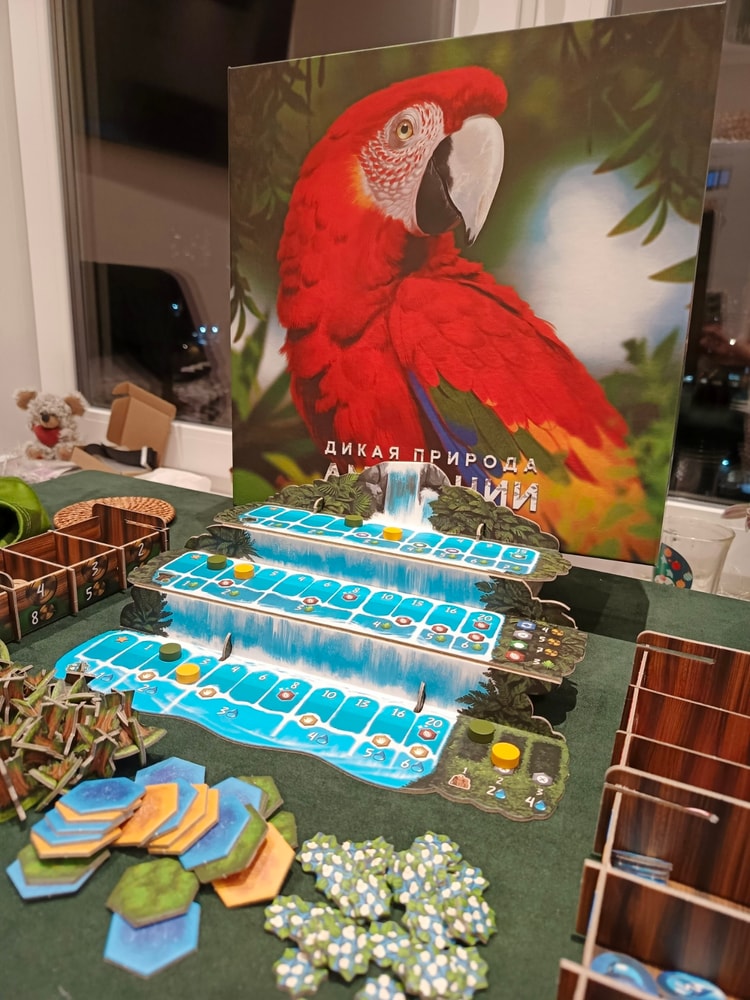 Очень расстроило качество картона, он местами расслаивается, коробка тяжелая, компонентов много. Тему природы я очень люблю, плюс игра от автора Крыльев и я на нее возлагала большие надежды.