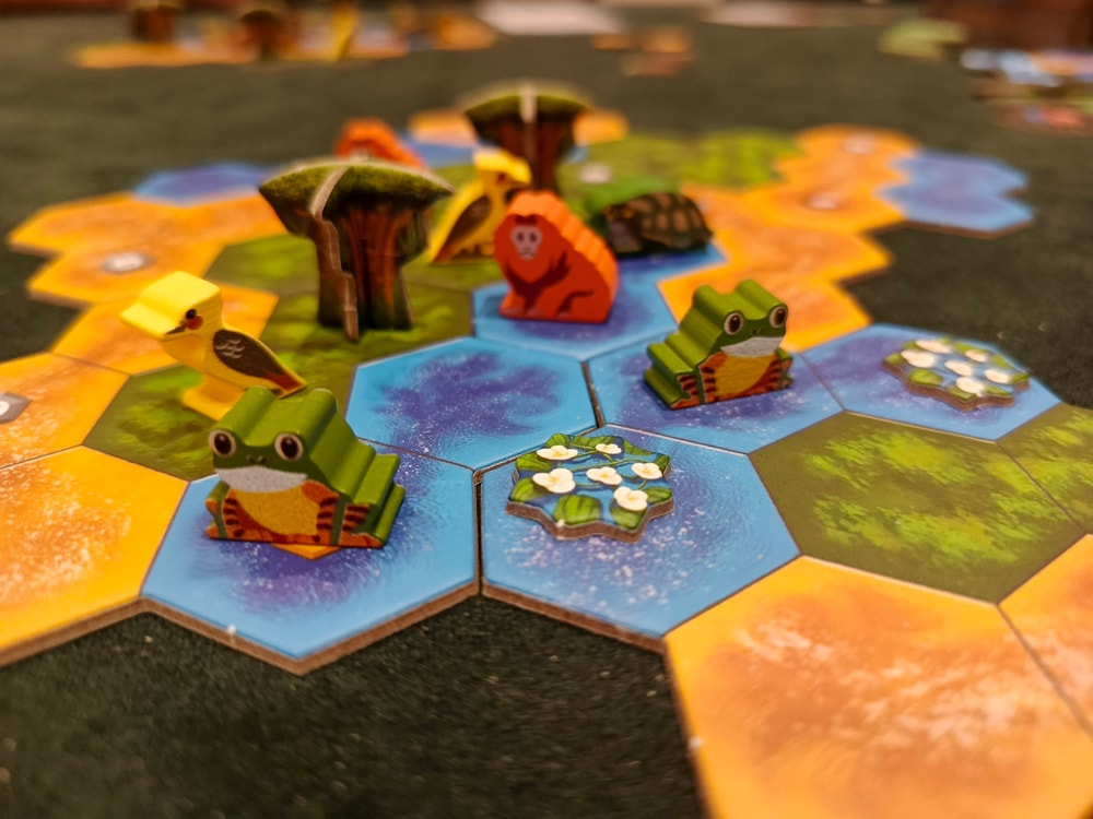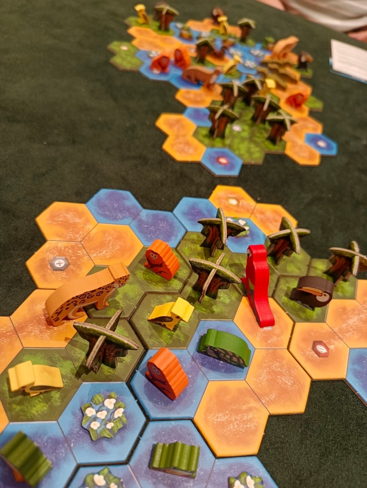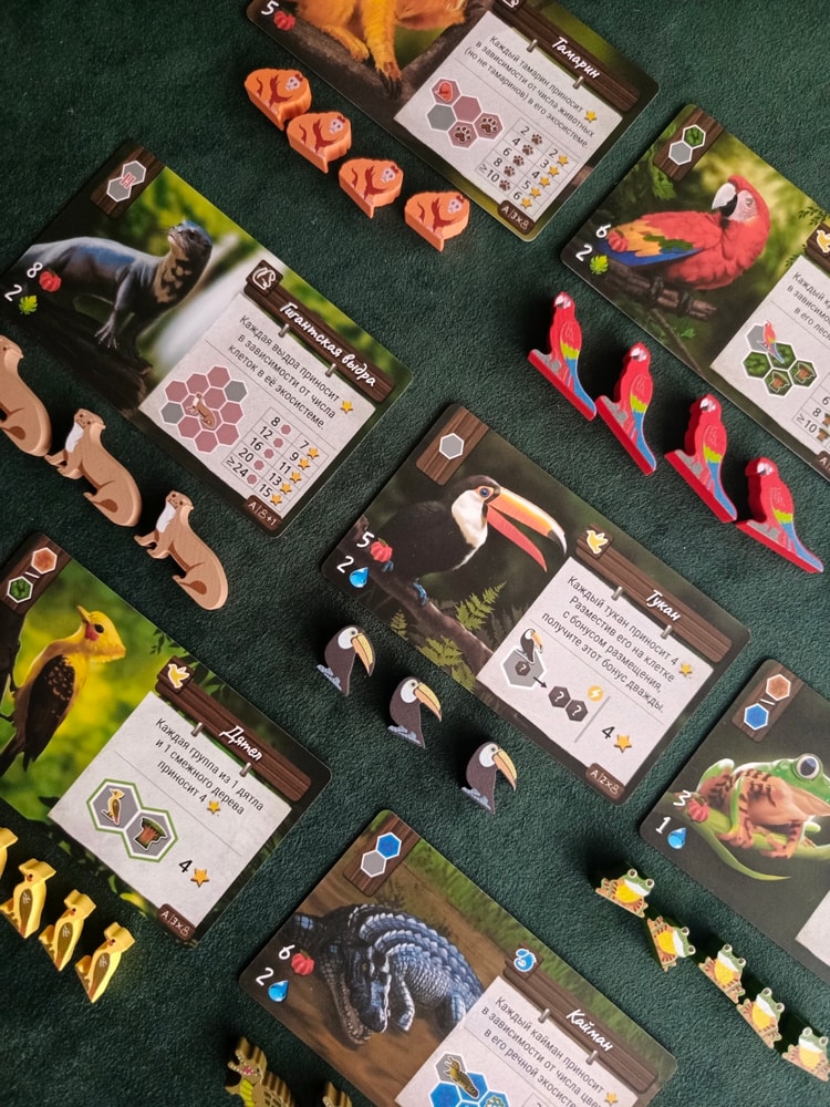 У каждого животного есть условие размещения, на какой тип местности его можно расположить, плюс цена за него. Животные имеют определенные условия соседства для начисления очков в конце игры. Как только на 5 карточках животных закончатся деревянные фигурки, игра подходит к концу.