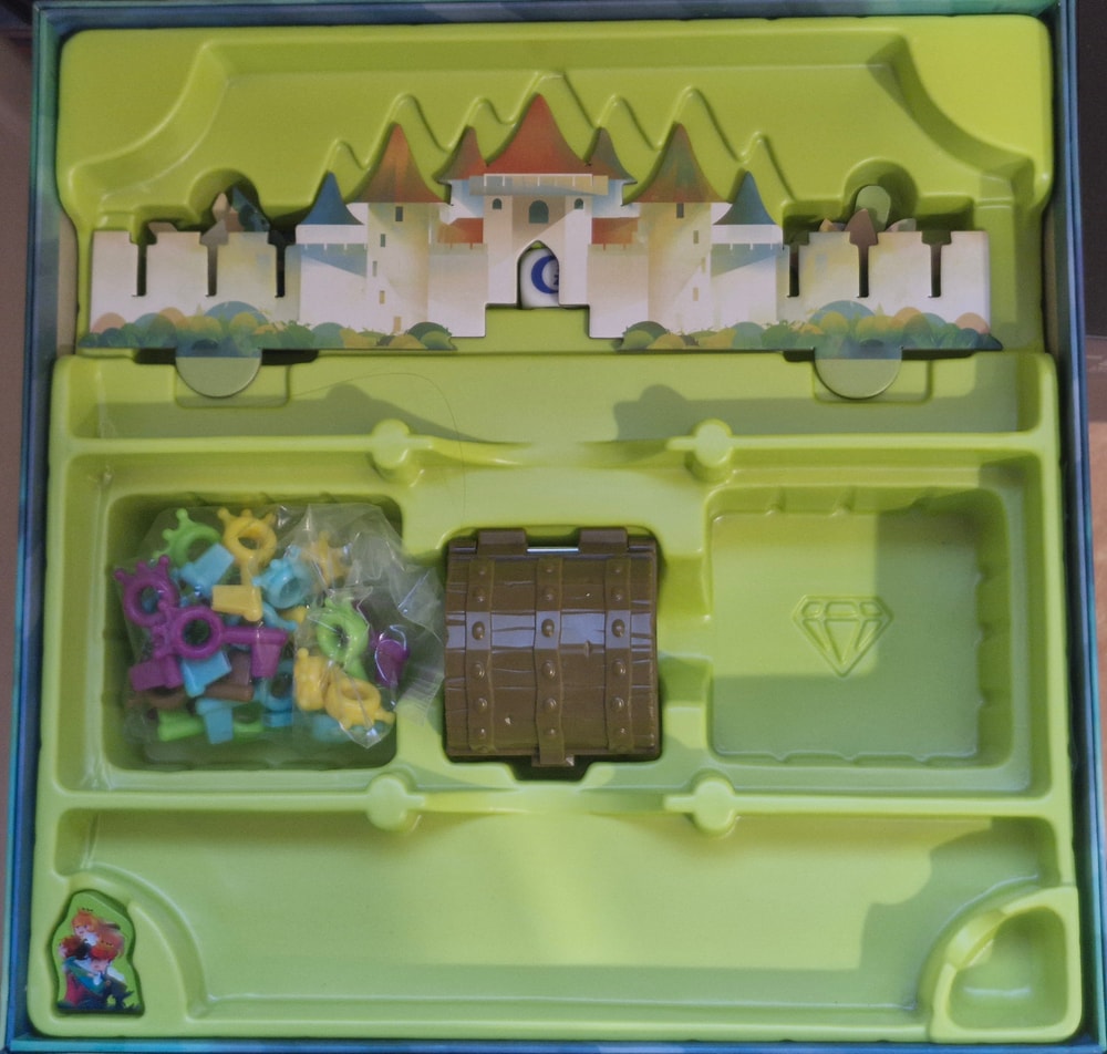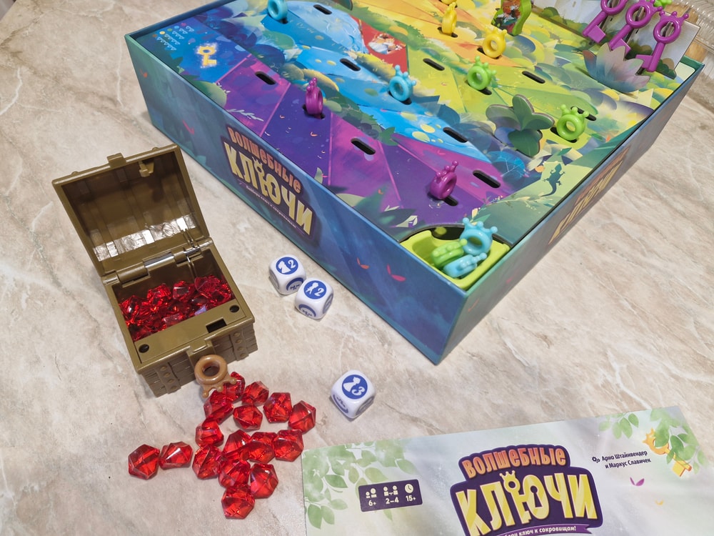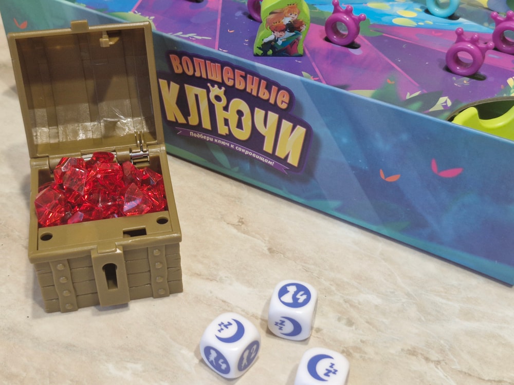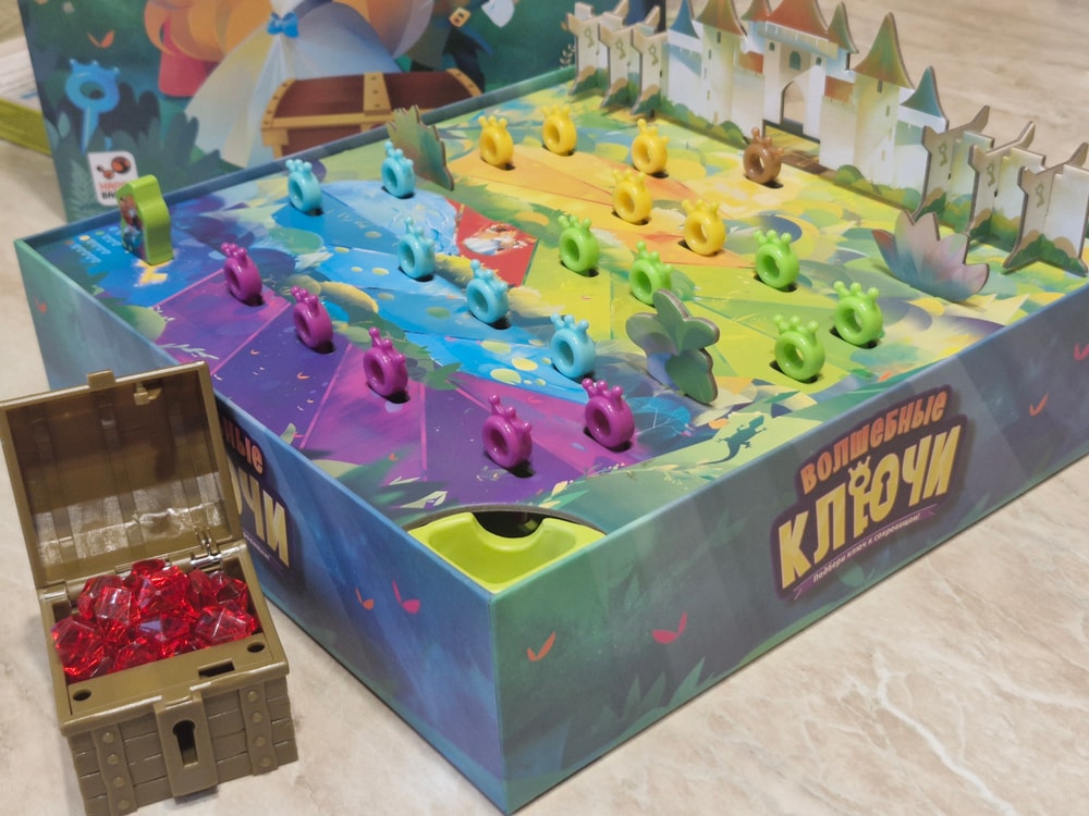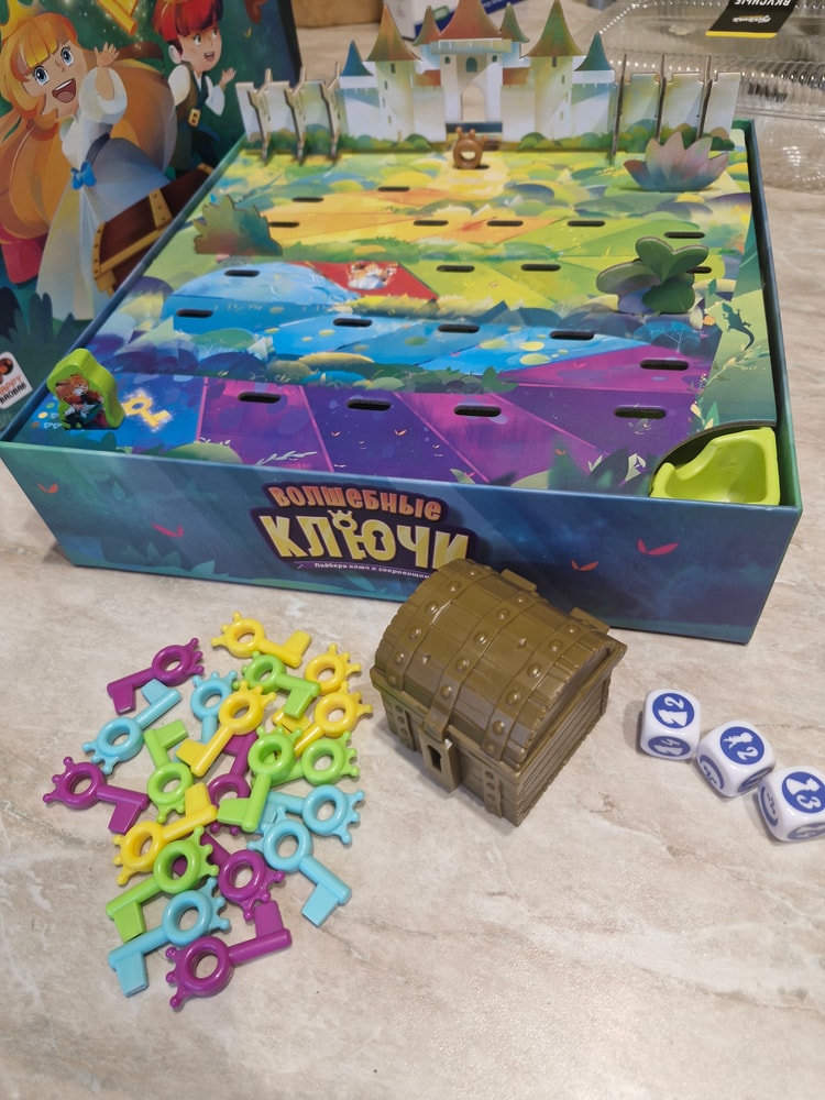 Каждый компонент на своём месте, это очень удобно! Кристаллы хранятся у нас прямо в сундуке, хотя и для них есть специальное место. Подготовка к игре занимает меньше минуты - поставил замок и кусты, расположил ключи, все! Качество картона супер, давно я такого толстого и гладкого не видела) Кубики прохладные, тяжёлые, мечта тактильного игрока)