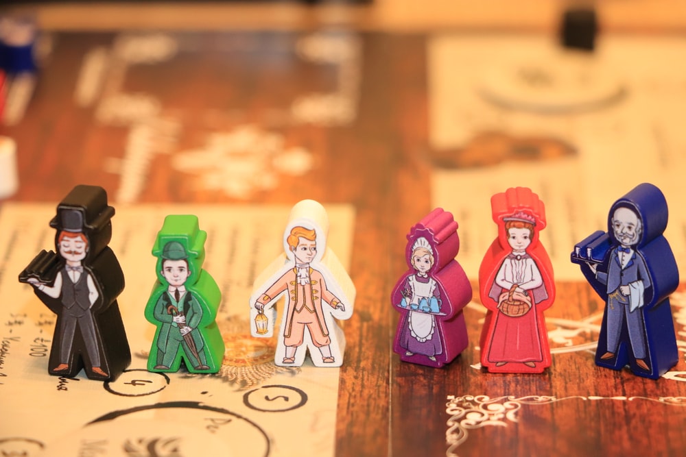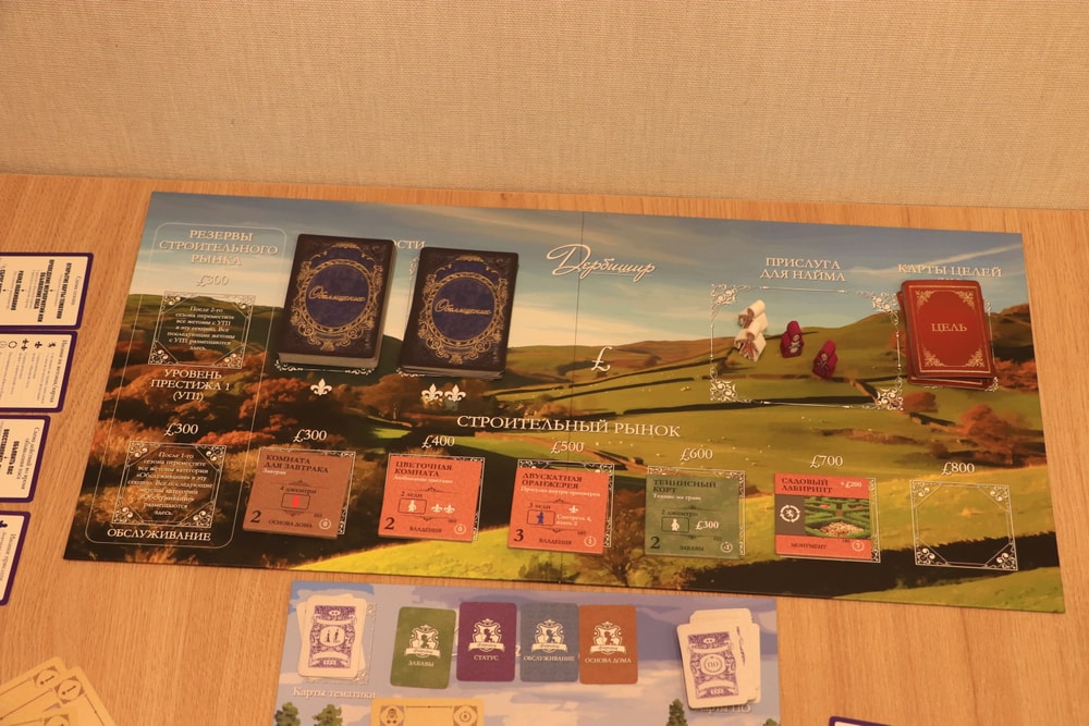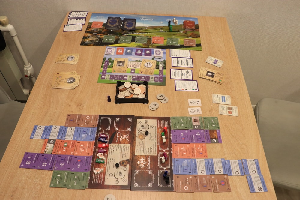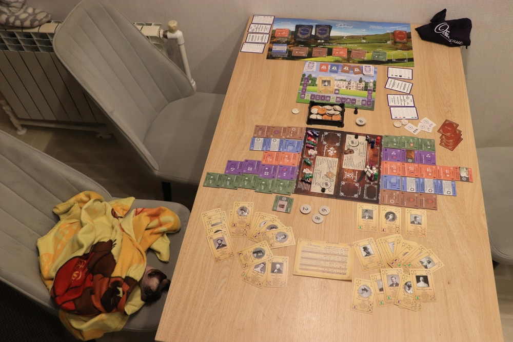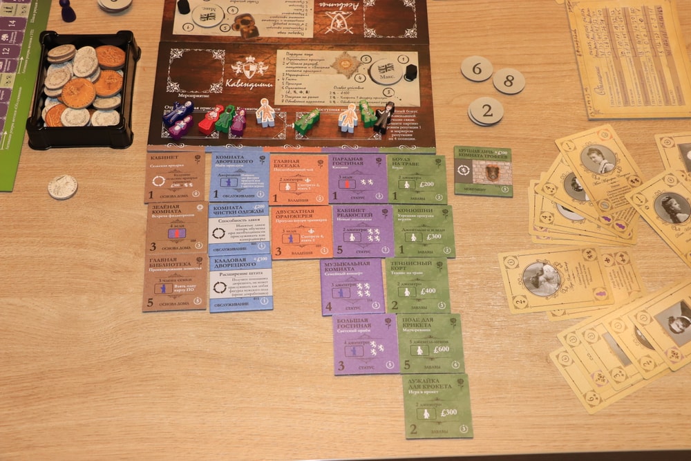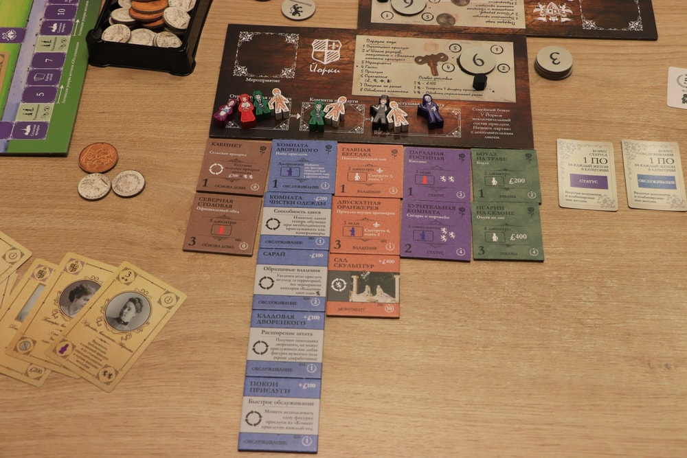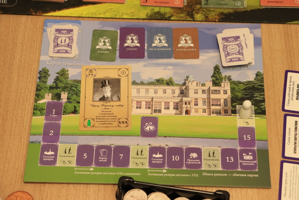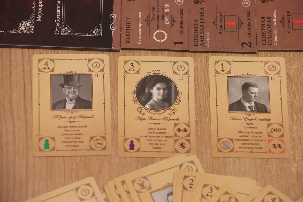 Кроме того в конце каждого сезона вы будете получать одобрение от влиятельных Фэйрчайлдов, если у вас в поместье больше определённых локаций, которые в этом сезоне нравятся влиятельным брату и сестре ( определяется картой, случайно вытянутой в начале сезона). Если Фэйрчайлд к вам благоволит, вы забираете его карту себе и получаете победные очки. И вот так раунд за раундом вы обустраиваете своё поместье, расширяя количество локаций в нём, увеличивая штат слуг, зарабатывая деньги, репутацию и приглашая гостей, чтобы стать самым влиятельным семейством в округе.