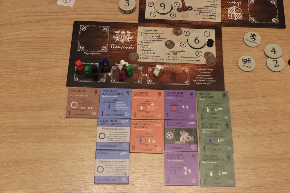 Каждая семья владеет начальным набором локаций для проведения светских мероприятий - это пять разноцветных квадратных жетонов внизу планшета поместья: