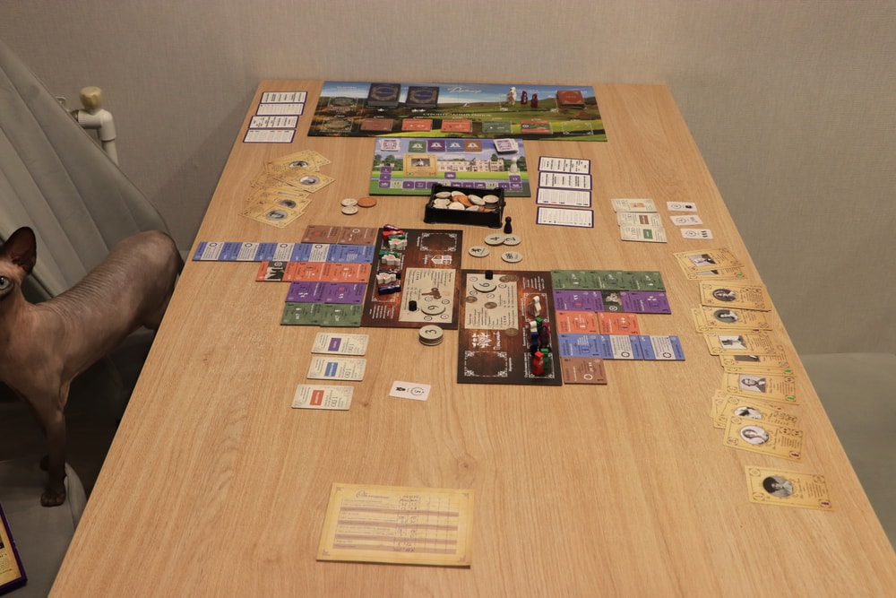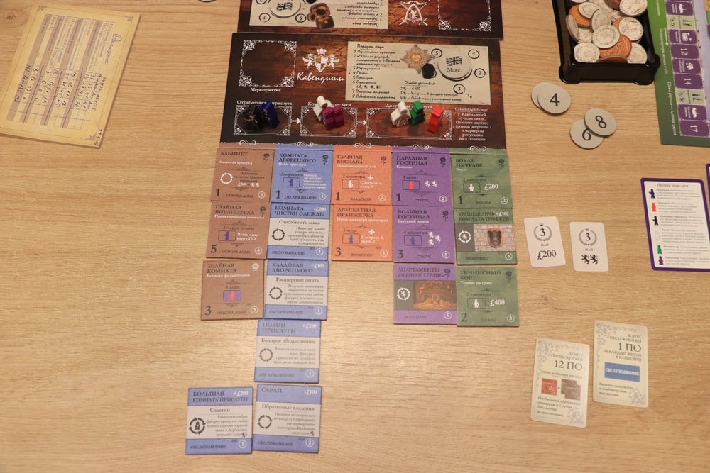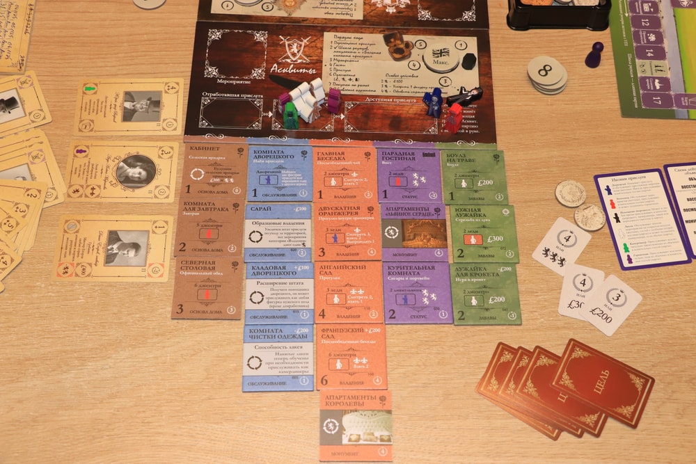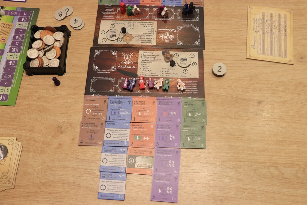 Подробно не буду писать про действия, но там всё хитро и тематично. Слуги после работы должны сначала отдохнуть, ими нельзя сразу воспользоваться, многие карты гостей работают в связке, эффекты у карт весьма разнообразные, репутация-это важно, ни один влиятельный гость не посетит ваше мероприятия, если ваша репутация ниже, чем его, жетоны локаций переворачиваются после проведения мероприятий, и на них меняется количество победных очков, есть особые раунды с определёнными эффектами и правилами на такой раунд. Нюансов очень много, но всё настолько интересно, что хочется копаться в этом глубже и глубже.
