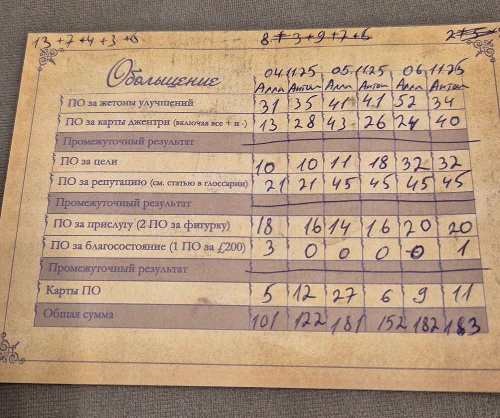 Игра из тех, в которые легко научиться играть, но вот играть эффективно и умно- это учиться и учиться. Как сегодня писала Галина, несложная игра. Категорически не согласна, игра ближе к хардкорной. Чтобы все эти действия правильно комбить и обойти соперника, нужен опыт и глубокое знание правил. Даже к третьей партии мы набрали на порядок больше победных очков, чем в первой. В первой партии мы просто барахтались без особого понимания как же в это играть: