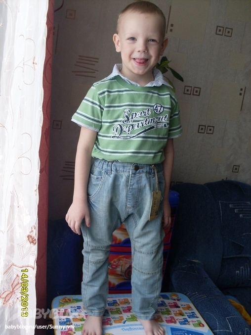 Хвастаемся)Вот и добрались руки выложить фотки сына в джинсах) Качество прекрасное) Цвет очень необычный - голубенький, но в тоже время с зелена как-то) Наш рост 113 см - джинсы размер 5-6 (на этикетке 116 см). Идут в размер! Сидят идеально, на весну-лето самое то!!!