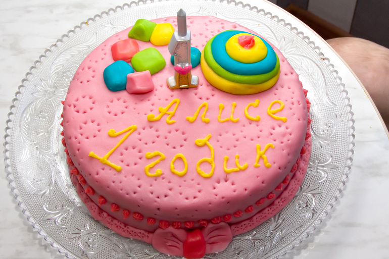Хочу подработать пока в декрете, делать торты на заказ. Был неудачный опыт с мастикой собственного приготовления ( из сгущёнки и пудры) вся таяла , растекалась форму не держала . Вот такой получился, делала дони на годик.