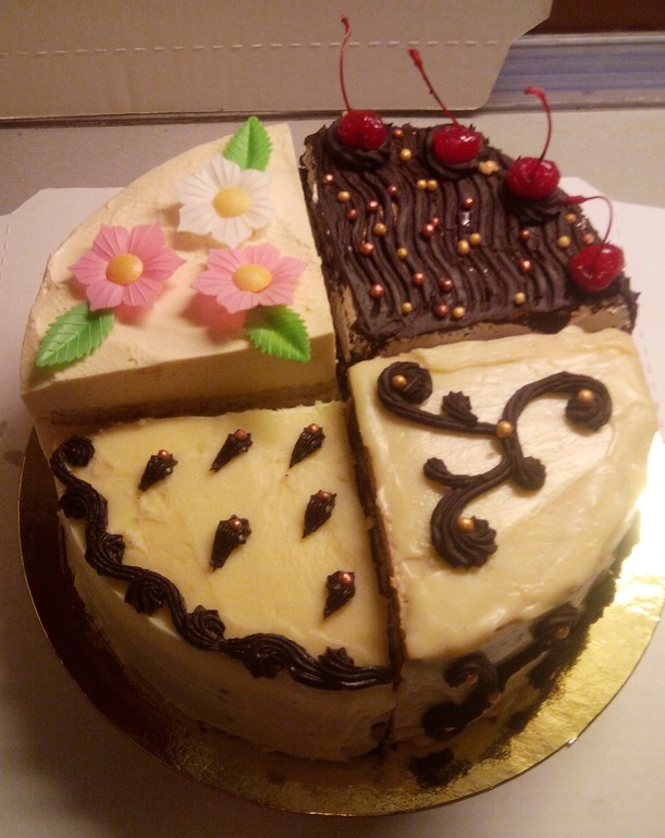 Может кому-нибудь надо. Общий вес 2,5кг 1. Черный лес. 2. Парфе вкус тропические фрукты. 3.Три шоколада. 4. Ореховый с карамельным кремом и меренгами.